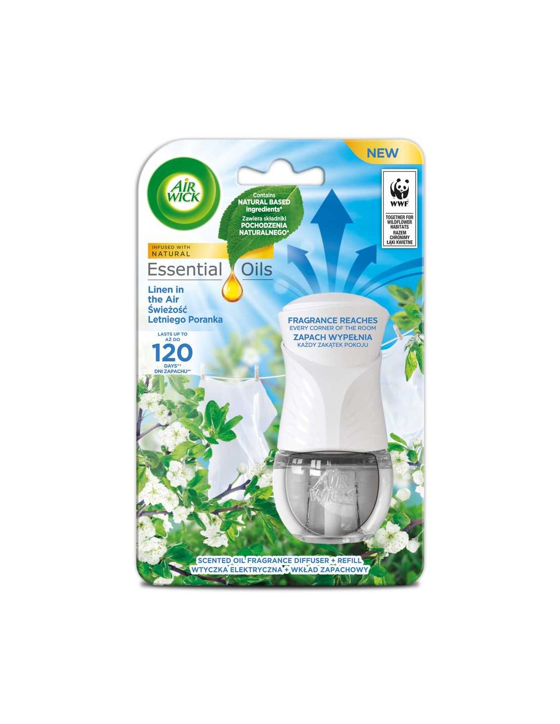 AIR WICK ESSENTIAL OILS Elektryczny odświeżacz powietrza urządzenie + wkład ŚWIEŻOŚĆ LETNIEGO PORANKA, 19 mlElektryczny odświeżacz powietrza Air Wick to świeżość letniego poranka w Twoim domu. Kiedy tylko chcesz – przez cały dzień i cały rok.W zestawie znajdziesz wszystko, czego do tego potrzebujesz. Naturalne olejki eteryczne gwarantują intensywność zapachu, a możliwość regulacji pozwala na wypełnienie domu świeżością nawet do 75 dni.Odświeżacze elektryczne Air Wick najlepiej sprawdzają się w średnich i dużych pomieszczeniach.Pamiętaj, że jeśli chcesz wyłączyć odświeżacz – np. w związku z wyjazdem – wystarczy wyciągnąć go z gniazda elektrycznego.Aby wyczyścić urządzenie, wyjmij wtyczkę z kontaktu i użyj suchej ściereczki.W opakowaniu znajdziesz urządzenie, czyli swój odświeżacz oraz buteleczkę z wybranym aromatem.Aby rozpocząć swoją zapachową przygodę najpierw odkręć korek buteleczki z zapachem.Wsuń buteleczkę do urządzenia do momentu, gdy usłyszysz charakterystyczny odgłos „kliknięcia”.Teraz wystarczy już tylko włożyć urządzenie do gniazda – pamiętaj jednak. aby zawsze było w pozycji pionowej.