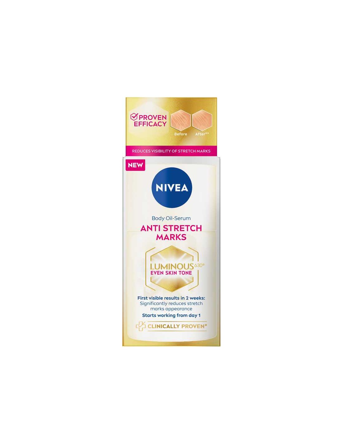 NIVEA ANTI STRETCH MARKS LUMINOUS630 Olejek-serum do ciała przeciw rozstępom, 100 mlWysoce skuteczny olejek -serum do ciała NIVEA ANTI STRETCH MARKS LUMINOUS630 pozwala pozbyć się niechcianych rozstępów. Formuła wyrównująca koloryt skóry zawiera opatentowany składnik aktywny LUMINOUS630®. Ujednolica nierównomierny koloryt skóry, aby znacząco zmniejszyć widoczność rozstępów.Jego regularne stosowanie zapewnia widoczne rezultaty już po dwóch tygodniach. Produkt został wzbogacony mieszanką naturalnych olejków, które sprawiają, że skóra staje się miękka i elastyczna. Przy regularnym stosowaniu nawilża skórę i zapewnia jej zdrowy wygląd. NIVEA ANTI STRETCH MARKS LUMINOUS630: