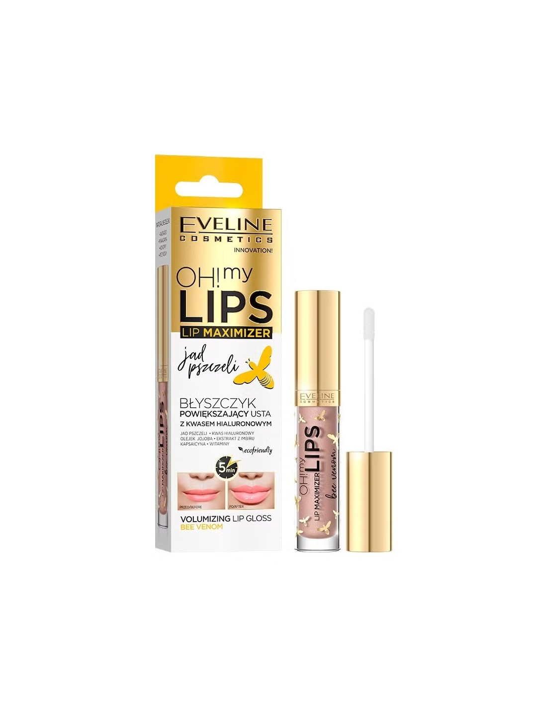 EVELINE OH MY LIPS Błyszczyk powiększający usta z kwasem hialuronowym i jadem pszczelim, 4,5 mlPowiększający usta błyszczyk Eveline zawiera innowacyjną technologię VOLUME MAXIMIZE™, dzięki której usta stają się widocznie pełniejsze już po zaledwie 5 minutach od aplikacji. Jest to możliwe dzięki naturalnym właściwościom jadu pszczoły, które rozszerzają naczynka krwionośne i poprawiają mikrokrążenie, dodając ustom pełnych kształtów.Formuła błyszczyku Eveline została wzbogacona o mieszankę luksusowych olejów: od odżywczego awokado, przez relaksujące konopie, aż po odżywcze makadamia. Dodatkowo, ekstrakt z imbiru i witaminy dogłębnie nawilżają, zmiękczają skórę ust i podkreślają ich naturalny blask.