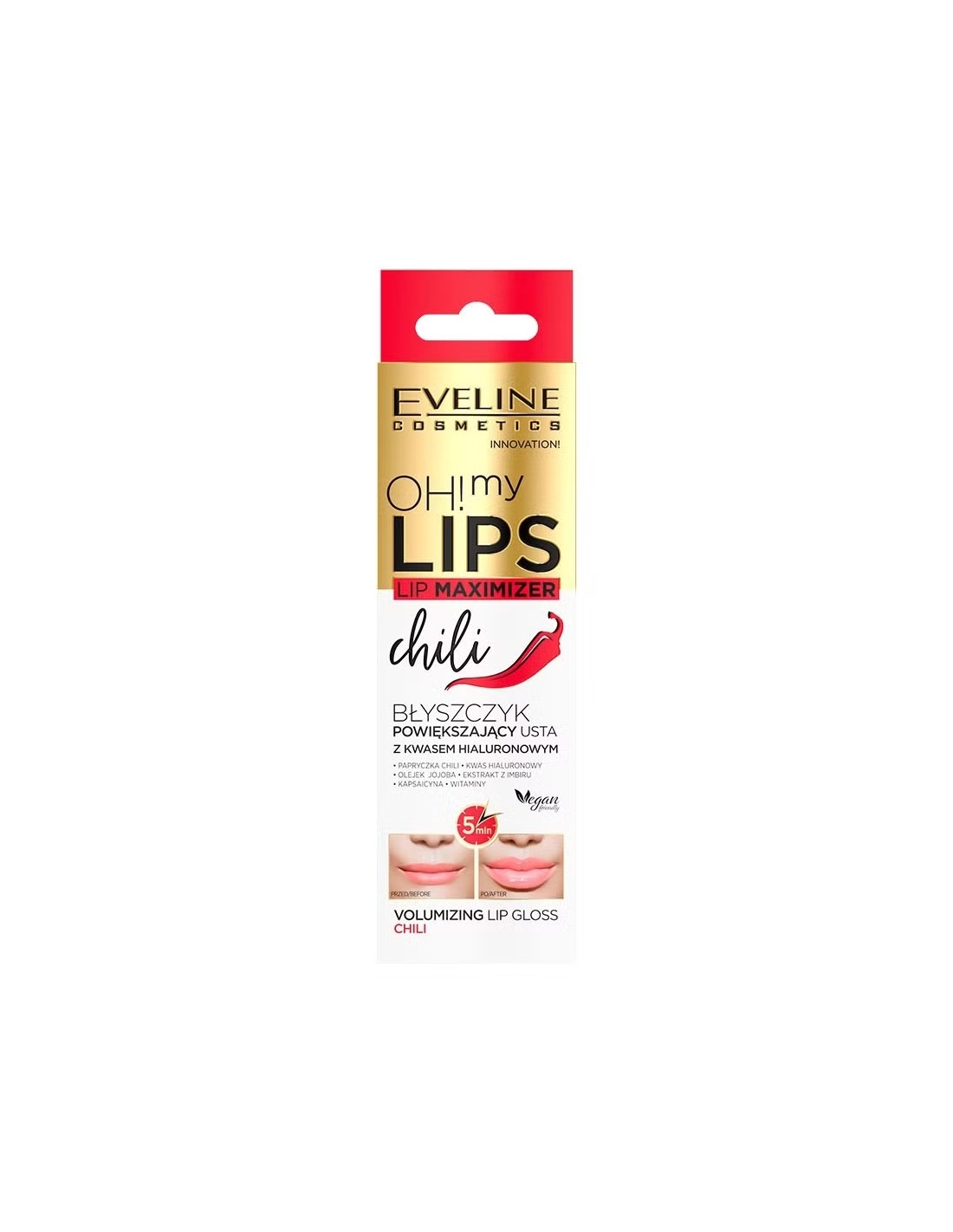 EVELINE OH MY LIPS Błyszczyk powiększający usta z kwasem hialuronowym CHILLI, 4,5 mlPowiększający usta błyszczyk Eveline zawiera innowacyjną technologię VOLUME MAXIMIZE™ z wyciągiem z papryczki chili, która natychmiast po kontakcie ze skórą ust dynamizuje mikrokrążenie i delikatnie rozszerza naczynka krwionośne. W efekcie już po chwili