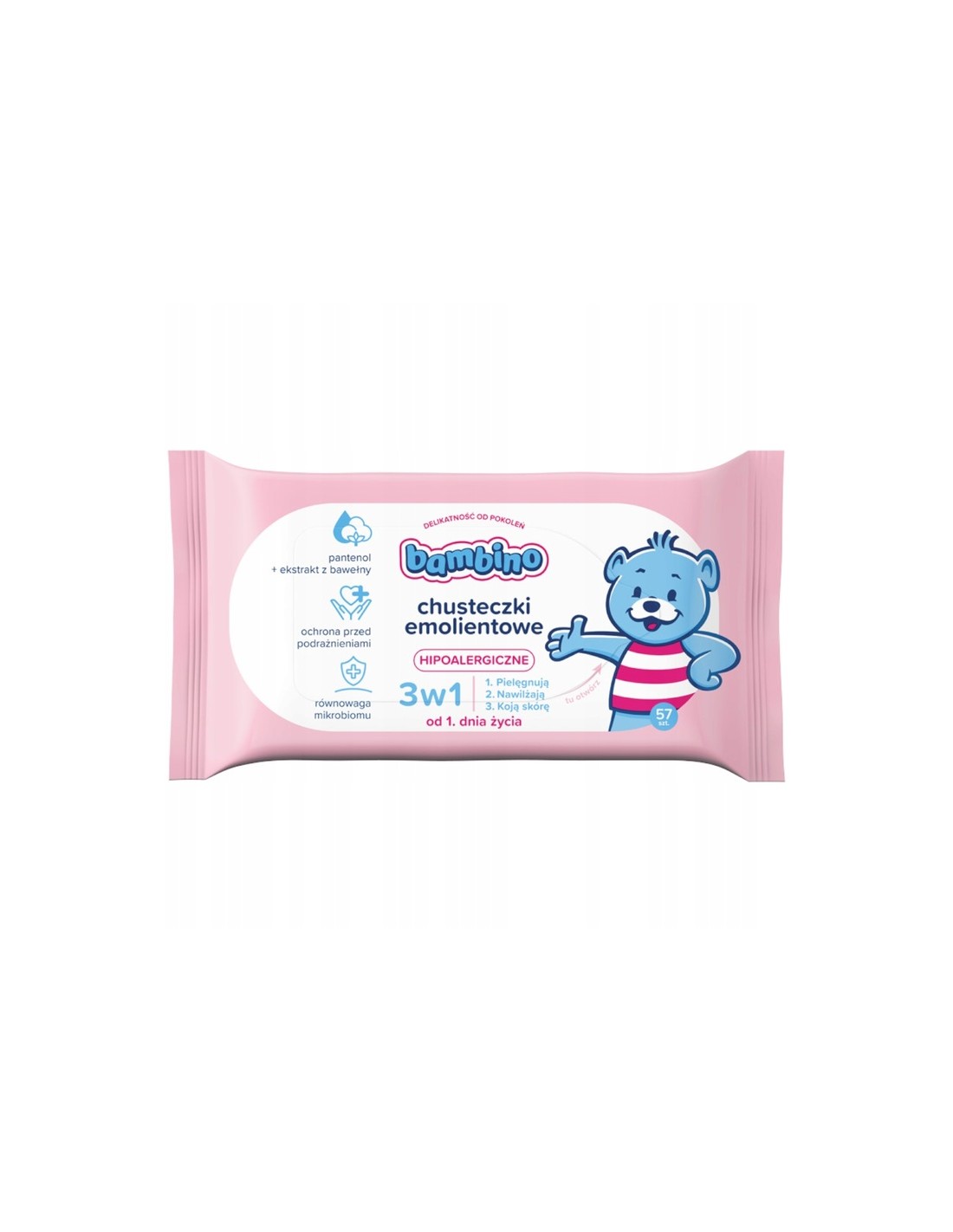 BAMBINO Chusteczki hipoalergiczne dla niemowląt i dzieci EMOLIENTOWE, 57 sztChusteczki emolientowe 3w1 to hipoalergiczny produkt stworzony specjalnie do pielęgnacji skóry wrażliwej niemowląt już od 1. dnia życia. Chusteczki wyjątkowo łagodnie oczyszczają skórę twarzy oraz całego ciała, jednocześnie zachowując jej naturalny płaszcz hydrolipidowy. Pozostawiają na skórze uczucie świeżości i przyjemny zapach.Wielozadaniowa formuła 3w1, wzbogacona o kompleks pielęgnujący z ekstraktem z nasion bawełny, witaminą E oraz pantenolem, zapewnia:1. Pielęgnację skóry2. Nawilżenie3. Ukojenie i łagodzenie podrażnień Tolerancja dla skóry i oczu została potwierdzona dermatologicznie oraz okulistycznie. Produkt posiada pozytywną opinię Instytutu Centrum Zdrowia Matki Polki.
