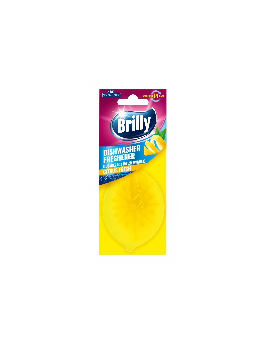 General Fresh Brilly Odświeżacz do Zmywarki Cytryna, 1 sztSkuteczny odświeżacz zmywarki o przyjemnym cytrusowym zapachu. Użytkownicy zmywarek niestety bardzo często borykają się z problemem nieprzyjemnego zapachu, który wydobywa się z ich wnętrza. Niezawodnym sposobem na jego rozwiązanie jest zastosowania odświeżacza do zmywarek o zapachu cytrynowym, który skutecznie zlikwiduje brzydkie aromaty i wypełni Twoją kuchnię świeżości.