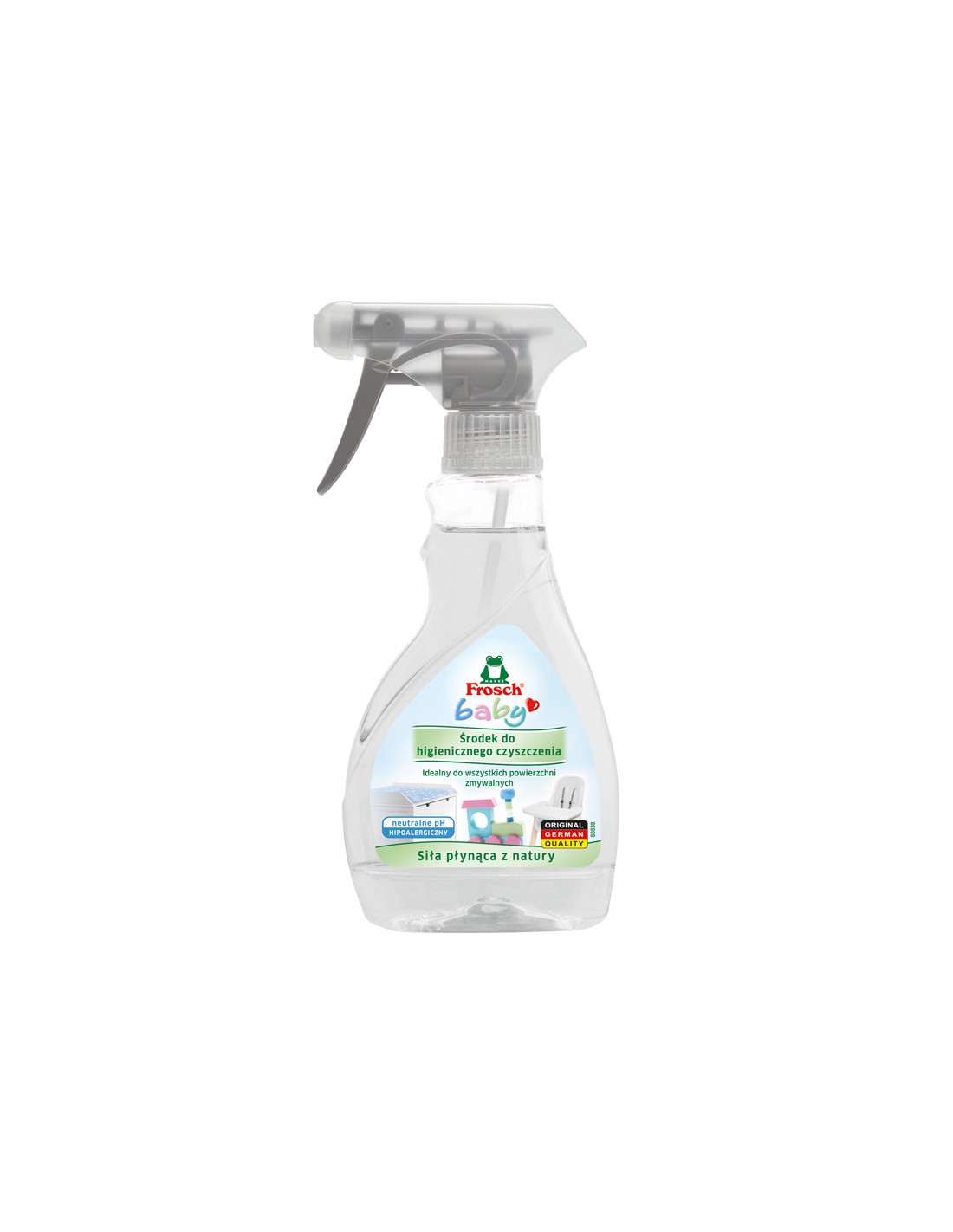 FROSCH Środek do higienicznego czyszczenia Hipoalergiczny FROSCH BABY, 300 ml – skuteczna i bezpieczna pielęgnacja otoczenia dzieckaKiedy dbasz o swoje dziecko, czystość najbliższego otoczenia to nie tylko wygoda, ale też element bezpieczeństwa. Ten spray został zaprojektowany, by ułatwić Ci utrzymanie higieny wokół malucha – od przewijaków, przez foteliki samochodowe, aż po zabawki. Dzięki niemu codzienne porządki stają się prostsze, a Ty możesz mieć większą pewność, że powierzchnie, z którymi styka się dziecko, są czyste i gotowe do użycia.Skuteczność i komfort – jak działa środek do higienicznego czyszczeniaFormuła sprayu opiera się na delikatnych środkach powierzchniowo czynnych, które skutecznie usuwają zabrudzenia z powierzchni zmywalnych bez potrzeby szorowania czy spłukiwania. Produkt działa szybko i łatwo – nanosząc go bezpośrednio na czyszczone miejsce lub na ściereczkę, po chwili wystarczy przetrzeć powierzchnię do sucha. To rozwiązanie, które oszczędza Twój czas i energię.