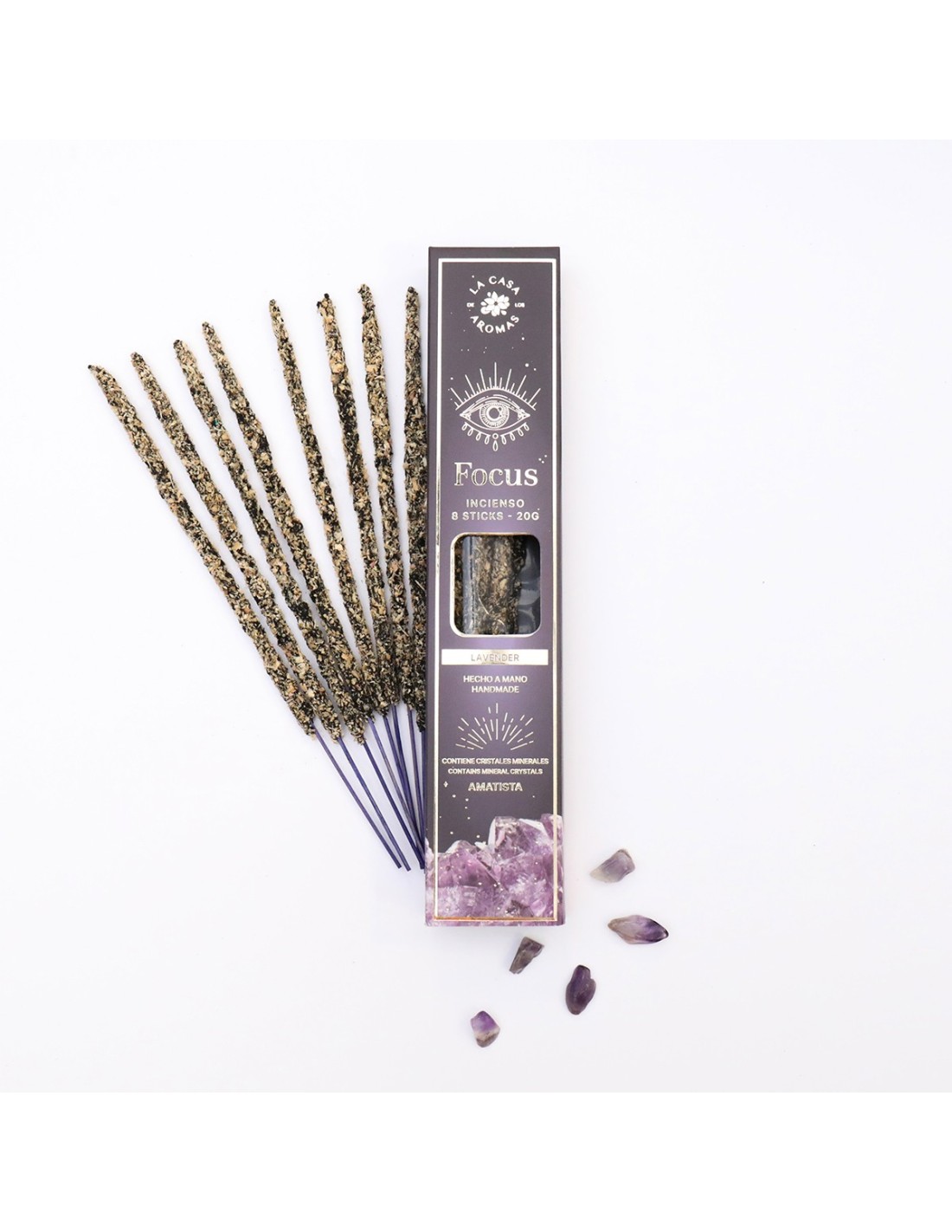 Opakowanie z kadzidłami posiada również kamienie Ametyst. Odmiana kwarcu charakteryzująca się fioletowym kolorem pochodzącym od inkluzji manganu i żelaza. Ametyst świetnie potęguje energie innych kryształów. Ametyst jest uważany za kamień wspierający ogólną równowagę w sferze fizycznej, emocjonalnej i umysłowej.Focus spokoju i aromaterapeutyczne działanie kadzidełKadzidła Mystic Focus to nie tylko zapach – to narzędzie, które wspiera dobre samopoczucie i koncentrację. Spalając się, kadzidło uwalnia intensywną, ale nieprzytłaczającą kompozycję zapachową, która: