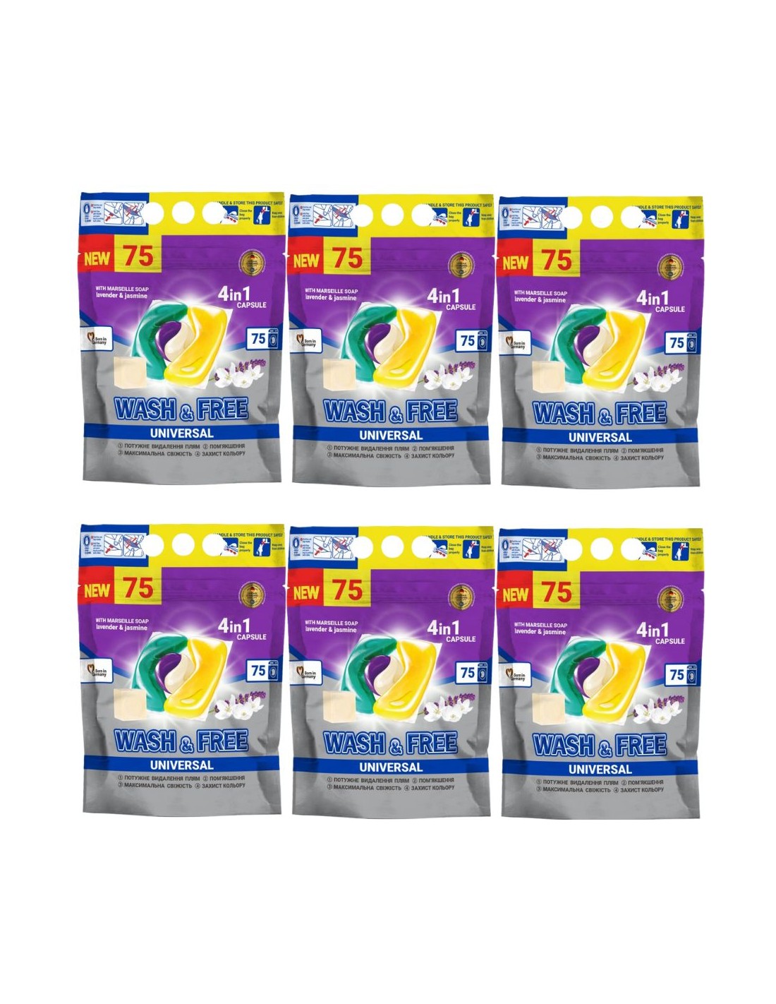 WASH&FREE 4w1 Uniwersalne kapsułki do prania LAWENDA JAŚMIN I MYDŁO MARSYLSKIE, pakiet 6 x 75 sztWypróbuj detergent do prania w postaci 4-komorowych kapsułek.Kapsułka całkowicie rozpuszcza się w wodzie, uwalniając swoją niesamowitą moc. Detergent jest bezpieczny dla środowiska. Nie zalecany do prania wyrobów wełnianych i jedwabnych.Unikalny skład kapsułek powoduje, że kapsułki WASH & FREE 4 W1 :