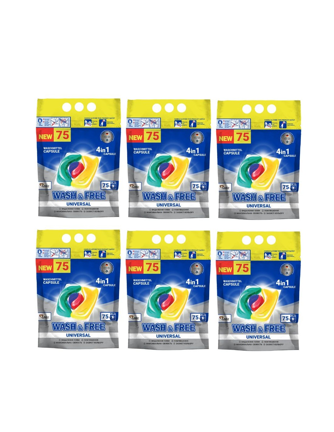 WASH&FREE 4w1 Uniwersalne kapsułki do prania, pakiet 6 x 75 sztWypróbuj detergent do prania w postaci 4-komorowych kapsułek.Kapsułka całkowicie rozpuszcza się w wodzie, uwalniając swoją niesamowitą moc. Detergent jest bezpieczny dla środowiska. Nie zalecany do prania wyrobów wełnianych i jedwabnych.Unikalny skład kapsułek powoduje, że kapsułki WASH & FREE 4 W1 :