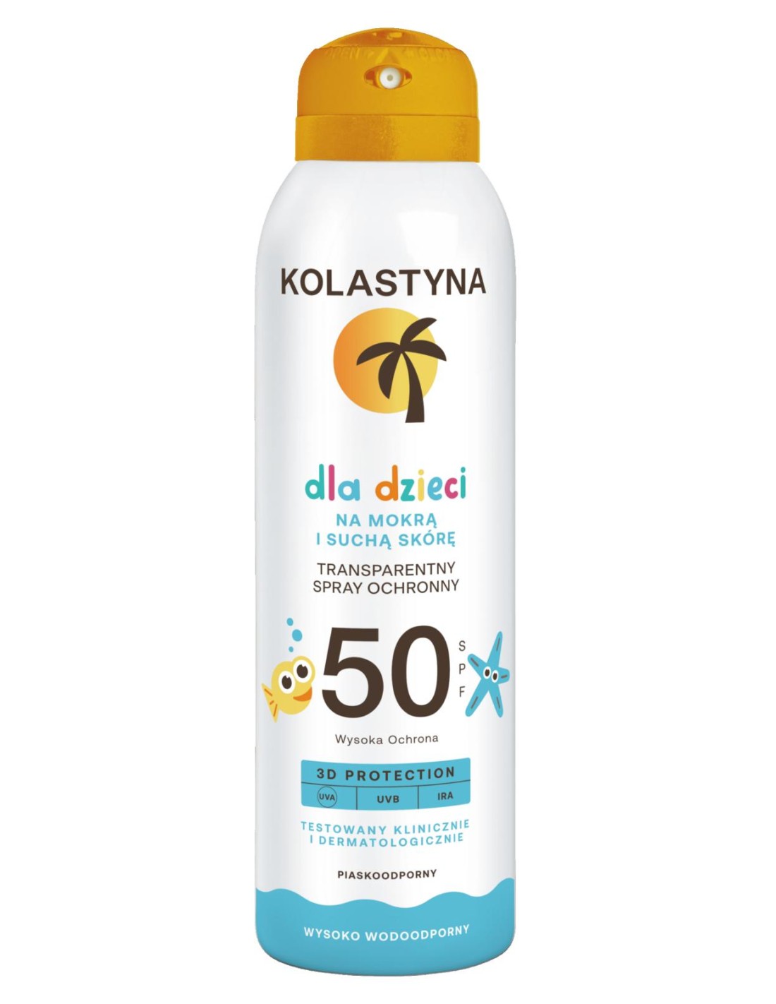 KOLASTYNA Spray ochronny dla dzieci SPF50 na mokrą i suchą skórę, 150 mlTransparentny spray ochronny na mokrą i suchą skórę - SPF50 Stworzony został dla dzieci powyżej 3 roku życia. Może być aplikowany zarówno na suchą, jak i mokrą skórę. W skuteczny sposób chroni przed trzema głównymi rodzajami promieniowania (UVA, UVB, IRA). Jego wegańska, transparentna formuła zapobiega przyklejaniu się piasku, dzięki czemu plażowanie staje się przyjemnością. Dodatkowo kosmetyk jest wodoodporny i bezpieczny dla raf koralowych. Wygodny 360° system aplikacji w który zostało wyposażone opakowanie pozwala na aplikowanie go w każdej pozycji.