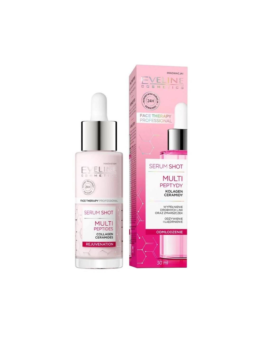EVELINE SERUM SHOT Kuracja multipeptydy na twarz, szyję i dekolt MULTI PEPTYDY, 30 ml Serum to silna dawka przeciwstarzeniowa dla dojrzałej, normalnej, suchej, czy odwodnionej skóry. 12 peptydów działa na cerę odżywczo i regeneracyjnie. Kolagen to doskonały składnik odmładzający, dzięki któremu widocznie poprawi się elastyczność i gęstość skóry. Ceramidy doskonale pielęgnują i odżywiają cerę oraz spłycają zmarszczki. Doskonale wzmacniają barierę ochronną skóry.- Działa przeciwstarzeniowo- Wygładza i odżywia cerę- Nawilża i uelastycznia- Redukuje zmarszczki i linie- Poprawia gęstość skóry- Na dzień i na noc- Formuła wegańskaSposób użycia: Nałóż na czystą i suchą skórę kilka kropli serum. Następnie nałóż ulubiony krem. Stosuj codziennie rano i/lub wieczorem. Składniki: AQUA (WATER),CAPRYLIC/CAPRIC TRIGLYCERIDE,GLYCERIN,ALOE BARBADENSIS LEAF JUICE,ETHYLHEXYL STEARATE,ISOPROPYL PALMITATE,PROPANEDIOL,TRIPELARGONIN,BETAINE,SEA WATER,PULLULAN,SIMMONDSIA CHINENSIS SEED OIL,GARDENIA JASMINOIDES MERISTEM CELL CULTURE,HYDROLYZED RHODOPHYCEAE EXTRACT,ALPHA-GLUCAN OLIGOSACCHARIDE,POLYMNIA SONCHIFOLIA ROOT JUICE,PANAX GINSENG ROOT EXTRACT,CARNOSINE,VEGETABLE COLLAGEN,TOCOPHERYL ACETATE,BUTYROSPERMUM PARKII BUTTER,LEUCONOSTOC/RADISH ROOT FERMENT FILTRATE,SERINE,ALANINE,GLYCINE,LACTOBACILLUS,N-PROLYL PALMITOYL TRIPEPTIDE-56 ACETATE,GLUTAMIC ACID,CERAMIDE NG,CERAMIDE NP,CERAMIDE AP,CERAMIDE EOP,LYSINE HCL,THREONINE,HEPTAPEPTIDE-7,LECITHIN,ACETYL HEXAPEPTIDE-49,PALMITOYL TRIPEPTIDE-38,ARGININE,TETRAPEPTIDE-4,PALMITOYL TRIPEPTIDE-1,OLIGOPEPTIDE-68,ACETYL HEPTAPEPTIDE-4,ACETYL HEXAPEPTIDE-8,PALMITOYL TETRAPEPTIDE-7,PROLINE,PALMITOYL TRIPEPTIDE-8,PALMITOYL HEXAPEPTIDE-12,DEXTRAN,PHYTOSPHINGOSINE,CHOLESTEROL,SODIUM LAUROYL LACTYLATE,LAURYL GLUCOSIDE,SODIUM PCA,GLYCINE SOJA OIL,HYDROGENATED LECITHIN,PENTAERYTHRITYL DISTEARATE,POLYGLYCERYL-2-DIPOLYHYDROXYSTEARATE,PHENOXYETHANOL,PENTYLENE GLYCOL,SODIUM LACTATE,POTASSIUM CETYL PHOSPHATE,SODIUM CARBOMER,HYDROXYACETOPHENONE,XANTHAN GUM,BUTYLENE GLYCOL,ETHYLHEXYLGLYCERIN,DISODIUM EDTA,CITRIC ACID,CARBOMER,HYDROXYPROPYL CYCLODEXTRIN,MALTODEXTRIN,C12-15 ALKYL BENZOATE,POLYSORBATE 20,PCA,CAPRYLYL GLYCOL,TRIBEHENIN,DIPEPTIDE DIAMINOBUTYROYL BENZYLAMIDE DIACETATE,POTASSIUM SORBATE,SODIUM BENZOATE,LACTIC ACID,SODIUM OLEATE,PARFUM (FRAGRANCE),CI 17200,CI 19140