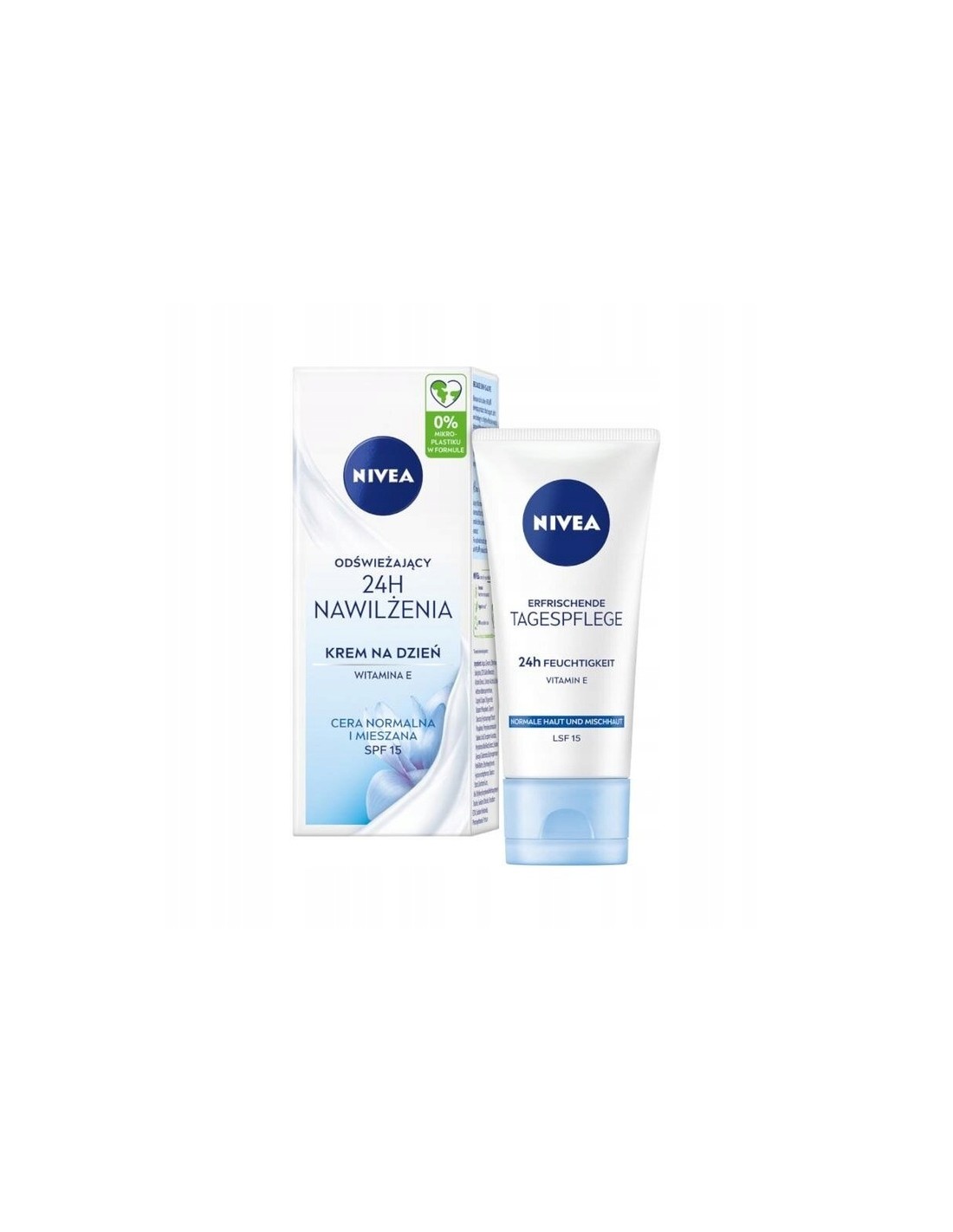 NIVEA 24H NAWILŻENIA Krem do twarzy na dzień SPF15 - cera mieszana 50 mlNIVEA Odświeżający Krem na dzień 24H nawilżenie odpowiedni na cery normalnej i mieszanej ma wyjątkową formułę zawierającą NIVEA Moisture Care Complex, Witaminę E, Naturaly ekstrakt z lilii wodnej oraz filtr SPF15. Krem intensywnie nawilża do 24 godzin, przywracając naturalną równowagę i poziom nawilżenia skóry, odświeża i wypełnia skórę szybko wchłaniającym się nawodnieniem oraz chroni skórę przed oddziaływaniem promieni słonecznych dzięki SPF15. NIVEA dba o Twoją skórę i planetę, dlatego formuła nie zawiera mikroplastiku i jest wegańska - bez składników pochodzenia zwierzęcego. Tolerancja dla skóry potwierdzona dermatologicznie. Unikaj bezpośredniego kontaktu z oczami.
