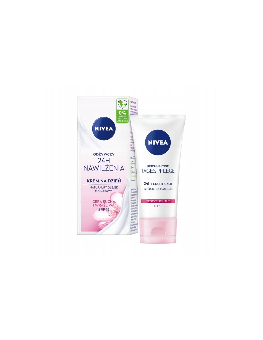 NIVEA 24H NAWILŻENIA Odżywczy krem na dzień, cera sucha i wrażliwa, 50 mlNIVEA Odżywczy Krem na dzień 24H NAWILŻENIA odpowiedni dla cery suchej i wrażliwej posiada wyjątkową formułę zawierającą NIVEA Moisture Care Complex, Naturaly olejek migdałowy oraz filtr SPF 15. Krem intensywnie nawilża do 24 godzin, przywracając naturalną równowagę i poziom nawilżenia skóry, dodatkowo głęboko odżywia i wygładza skórę oraz chroni skórę przed oddziaływaniem promieni słonecznych dzięki SPF 15. NIVEA dba o Twoją skórę i planetę, dlatego formuła nie zawiera mikroplastiku i jest wegańska - bez składników pochodzenia zwierzęcego. Tolerancja dla skóry została potwierdzona dermatologicznie. Unikaj bezpośredniego kontaktu z oczami.• Formuła nie zawiera mikroplastiku• Formuła wegańska - bez składników pochodzenia zwierzęcego• Intensywnie nawilża do 24 godzin, przywracając naturalną równowagę i poziom nawilżenia skóry• Głęboko odżywia i wygładza skórę• Chroni skórę przed oddziaływaniem promieni słonecznych dzięki SPF15
