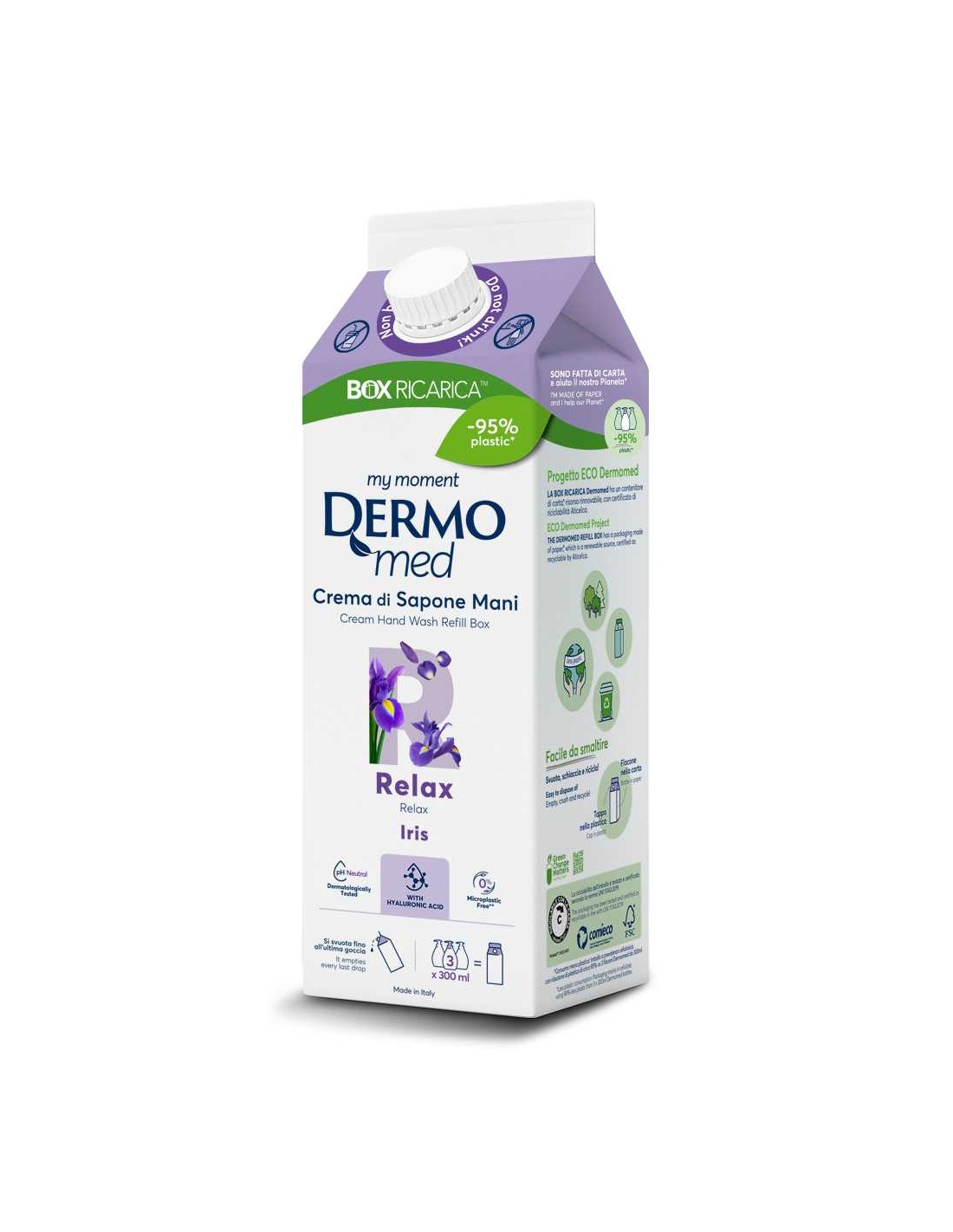 ECO DERMOMED PROJECT - opakowanie mydła zostało wykonane z papieru, który jest odnawialnym źródłem, certyfikowane jako nadające się do recyklingu przez Aticelca.