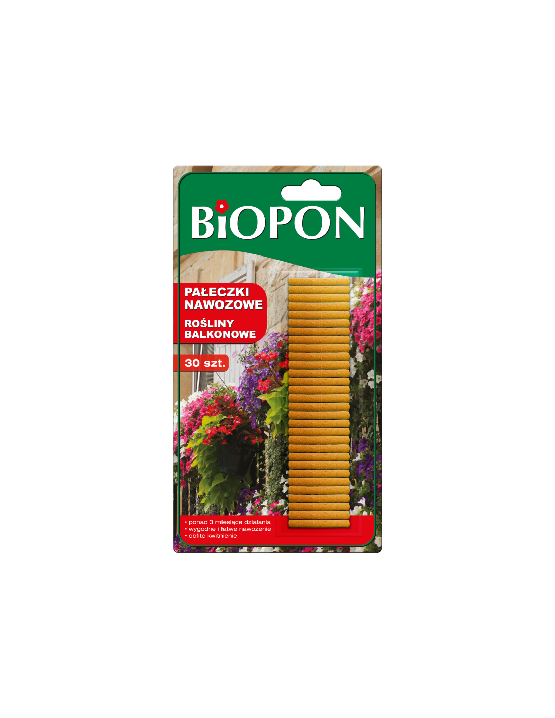 AZOT 12%, FOSFOR 8%, POTAS 10% z mikroelementamiWieloskładnikowy nawóz w postaci pałeczek przeznaczony do pielęgnacji ozdobnych roślin balkonowych (begonie, surfinie, fuksje, itd.). Bogaty zestaw substancji mineralnych, w tym zwiększona dawka łatwo przyswajalnego żelaza, pobudza zawiązywanie silnych pąków i daje piękne wybarwienie kwiatów. Nawożone rośliny są mniej wrażliwe na wiatr oraz lekkie przymrozki. Nawóz jest wydajny, szybko przyswajalny i wygodny w użyciu. Pałeczki stopniowo ulegają rozpuszczeniu przez co rośliny otrzymują pokarm regularnie i długotrwale – do 2 miesięcy.