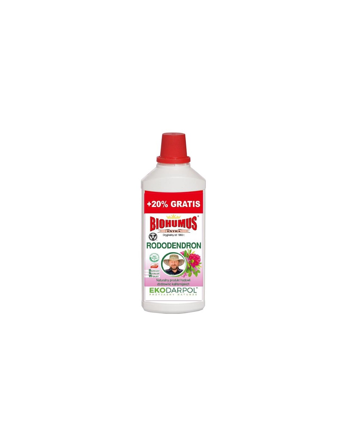 EKODARPOL BIOHUMUS Naturalny Nawóz płyn do Rodendronów 1 l + 20% gratisWzmacnia rośliny i wspomaga kwitnienie. Wpływa na rozrost i zwiększone zawiązywanie pąków kwiatowych w fazie kwitnienia. Sprawia, że rośliny są zdrowe, bujne i soczyście zielone. Nawożenie roślin nawozami naturalnymi to alternatywa dla tych, którzy chcą prowadzić ogród ekologiczny. Przeciwnicy stosowania chemii w ogrodzie powinni sięgnąć po nawozy organiczne. Nawozy biohumusowe nie tylko nawożą, ale i poprawiają ogólny stan gleby.Biohumus Extra to łatwo przyswajalny nawóz, zawierający bardzo bogatą mikroflorę bakteryjną oraz próchnicę pokarmową, który zapewni optymalny wzrost i rozwój rododendronów.Wytworzony z wyselekcjonowanych oborników uszlachetnionych przez dżdżownice kalifornijskie, które znacznie podnoszą zawartość mikroflory bakteryjnej. Zawiera naturalnie namnożone pozytywne bakterie, między innymi azotobacter, pseudomonas, bakterie fosforowe, celulolityczne, promieniowce oraz bakterie przetrwalnikowe.Zalety: