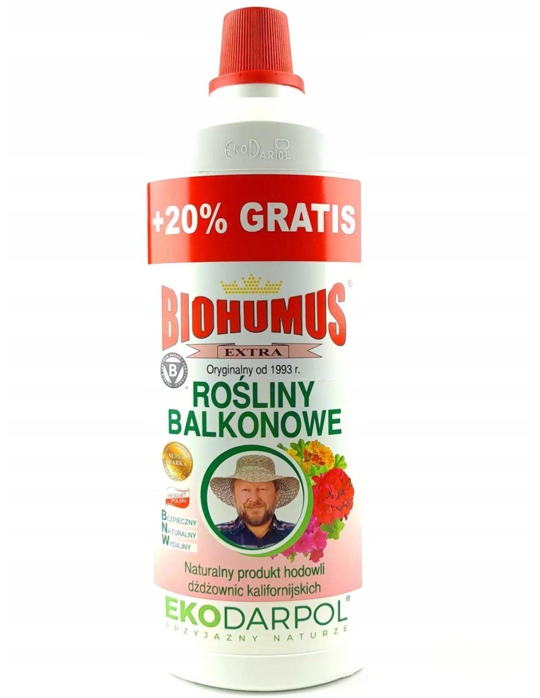 EKODARPOL BIOHUMUS Naturalny nawóz do kwiatów balkonowych, 1 l + 20% gratisNawożenie to proces, który ma za zadanie uzupełnić w podłożu brakujące składniki, dzięki którym rośliny będą mogły bujniej kwitnąć i ładniej się rozrastać. Najlepiej wybierać nawozy dedykowane konkretnym grupom roślin, by dostarczyć dla nich jak najwłaściwsze dawki mikroelementów.Zalety:– uodparnia rośliny na choroby– niweluje przedawkowanie nawozami mineralnymi– powoduje długotrwałe i lepsze kwitnienie– bezpieczny dla ludzi, zwierząt i środowiska– naturalny, bez chemii– nieprzedawkowalny i wygodny w użyciuJeśli nie chcemy zniszczyć roślin przez ich przenawożenie, powinniśmy wybrać preparat naturalny Biohumus Extra do kwiatów balkonowych. W składzie zawiera produkty pochodzące z hodowli dżdżownicy kalifornijskiej, dlatego jego stosowanie nie wiąże się z ryzykiem uszkodzenia roślin. Biohumus Extra do kwiatów balkonowych dodatkowo poprawia jakość podłoża i sprzyja rozwojowi pożytecznych mikroorganizmów oraz flory bakteryjnej.Stosowanie:Do każdego podlewania 15-20 ml na 1 litr wody. Na dobrych podłożach można zmniejszyć dawkę o połowę. Do ratowania roślin: bez rozcieńczania 2-5 nakrętek bezpośrednio pod roślinę.Chronić przed nagrzaniem, przechowywać w temperaturze od +5 do +30 C.Pojemność 1l + 200ml gratis.