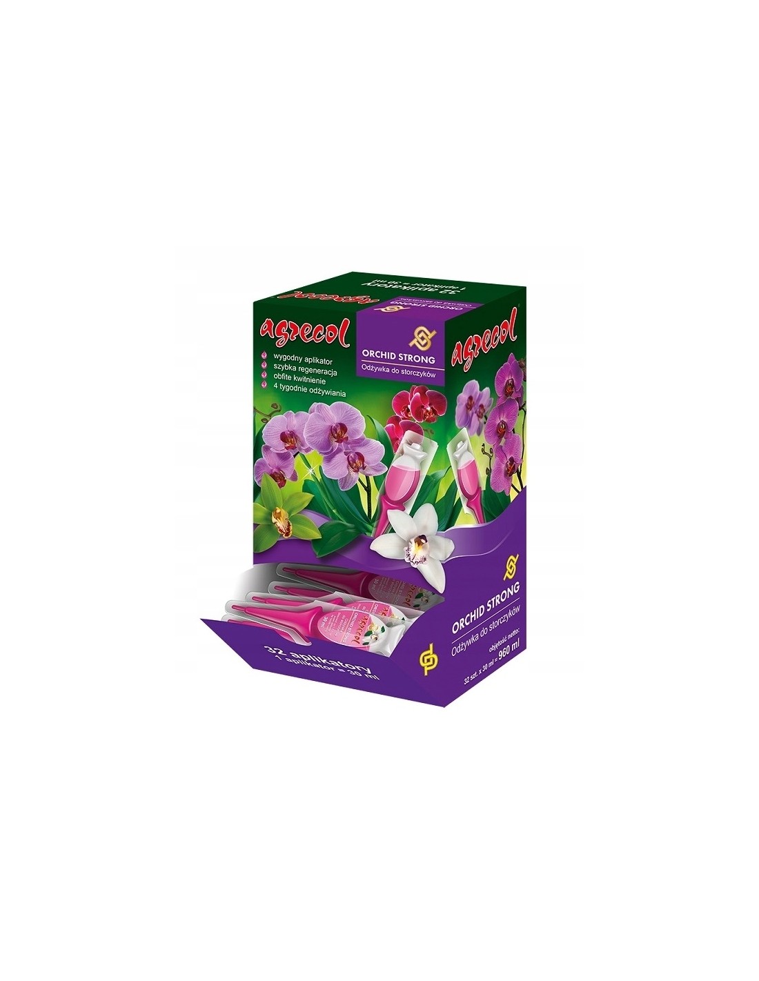 AGRECOL Odżywka do storczyków ORCHIDEA 32 x 30 mlOrchid Strong – odżywka do storczyków to specjalistyczny i wyjątkowo innowacyjny preparat przeznaczony do regeneracji wszystkich gatunków storczyków.Specjalna formuła pobudza, wzmacnia i przedłuża kwitnienie.Regularne stosowanie wpływa na dobrą kondycję systemu korzeniowego, zapewniając odpowiednią sprężystość liści oraz ich soczysto zielone wybarwienie.Profesjonalne, estetyczne i gotowe do użycia aplikatory ułatwiają stosowanie.Cechy produktu: