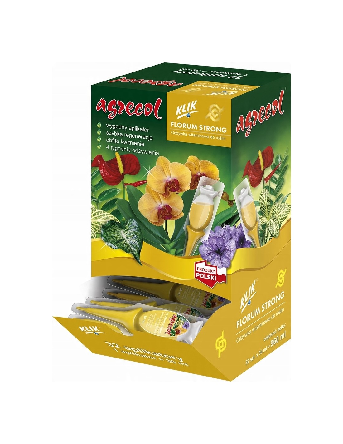 Agrecol Florum Strong odżywka do roślin 32x30 ml – szybka regeneracja i odporność dla domowych roślin ozdobnych Jeśli twoje rośliny doniczkowe wyglądają na osłabione, nie rosną jak dawniej lub tracą intensywny kolor liści – być może brakuje im odpowiednich mikroelementów i witamin. Z pomocą przychodzi Agrecol Florum Strong – skoncentrowana, witaminowa odżywka w praktycznych ampułkach, która działa jak codzienna porcja energii dla roślin.To uniwersalne wsparcie dla kwiatów zielonych i kwitnących, które pozwala szybko odbudować kondycję, wzmocnić odporność i pobudzić do intensywnego wzrostu – bez ryzyka przenawożenia. Wielokierunkowe działanie – dla zdrowych i silnych roślin Odżywka Florum Strong została opracowana jako szybka kuracja regenerująca i wzmacniająca dla roślin, które przeszły stres lub wymagają dodatkowego wsparcia. To idealne rozwiązanie, gdy zauważysz: