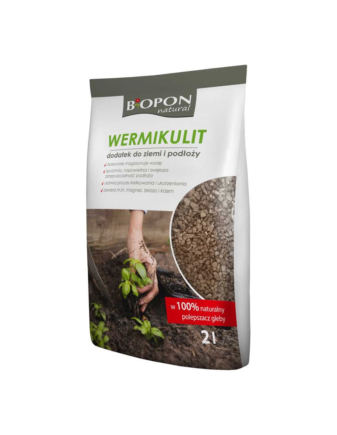 BIOPON Wermikulit Naturalny Dodatek Do Podłoża Napowietrzający Glebę 2LWermikulit ogrodniczy 2L to w pełni naturalny produkt mineralny poprawiający strukturę i przepuszczalność gleby. Powstaje w wyniku obróbki termicznej minerału ilastego o warstwowej strukturze, dzięki czemu przyjmuje postać lekkich, porowatych granulek o zdolności zatrzymywania wody. Dodatek wermikulitu do podłoża spulchnia glebę, zwiększa jej napowietrzenie oraz wspomaga równomierne kiełkowanie nasion. Zawarte w nim pierwiastki – magnez, żelazo i krzem – pozytywnie wpływają na wzrost i zdrowie roślin.