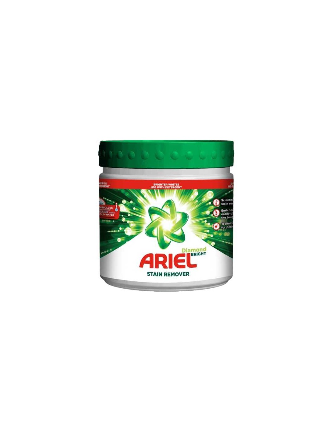 ARIEL DIAMOND BRIGHT Odplamiacz do tkanin BIEL, 500 gOdplamiacz ARIEL DIAMOND BRIGHT przeznaczony jest do usuwania świeżych oraz zaschniętych plam z białych i jasnych tkanin.Odplamiacz ARIEL zawiera formułę, która skutecznie usuwa różnego rodzaju plamy. Odplamiacz w postaci proszku można dozować profilaktycznie do każdego prania lub jako roztwór bezpośrednio na plamę. Jest skuteczny i w niskiej temperaturze i podczas krótkich cykli prania.Dodatkowo, technologia odplamiacza odświeża biel, chroni przez szarzeniem i zapobiega żółknięciu tkanin.Skład: >30% związki wybielające na bazie tlenu; >5% niejonowe środki powierzchniowo czynne; rozjaśniacze optyczne; kompozycje zapachowe.UWAGA: Szata graficzna może nieco różnić się od prezentowanej.
