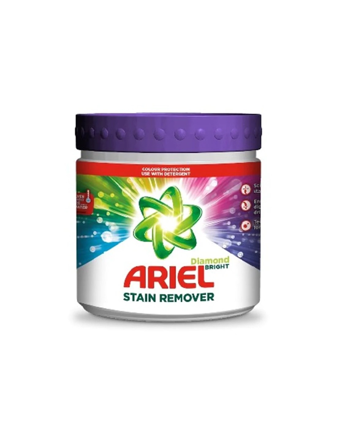 ARIEL DIAMOND BRIGHT Odplamiacz do tkanin KOLOR, 500 gOdplamiacz ARIEL DIAMOND BRIGHT przeznaczony jest do usuwania świeżych oraz zaschniętych plam z kolorowych tkanin.Odplamiacz ARIEL zawiera formułę, która skutecznie usuwa różnego rodzaju plamy. Odplamiacz w postaci proszku można dozować profilaktycznie do każdego prania lub jako roztwór bezpośrednio na plamę. Jest skuteczny i w niskiej temperaturze i podczas krótkich cykli prania.Dodatkowo, technologia odplamiacza odświeża, ale także dba o włókna i chroni kolory tkanin przed szarzeniem.Skład: >30% związki wybielające na bazie tlenu; >5% niejonowe środki powierzchniowo czynne; rozjaśniacze optyczne; kompozycje zapachowe.UWAGA: Szata graficzna może nieco różnić się od prezentowanej.
