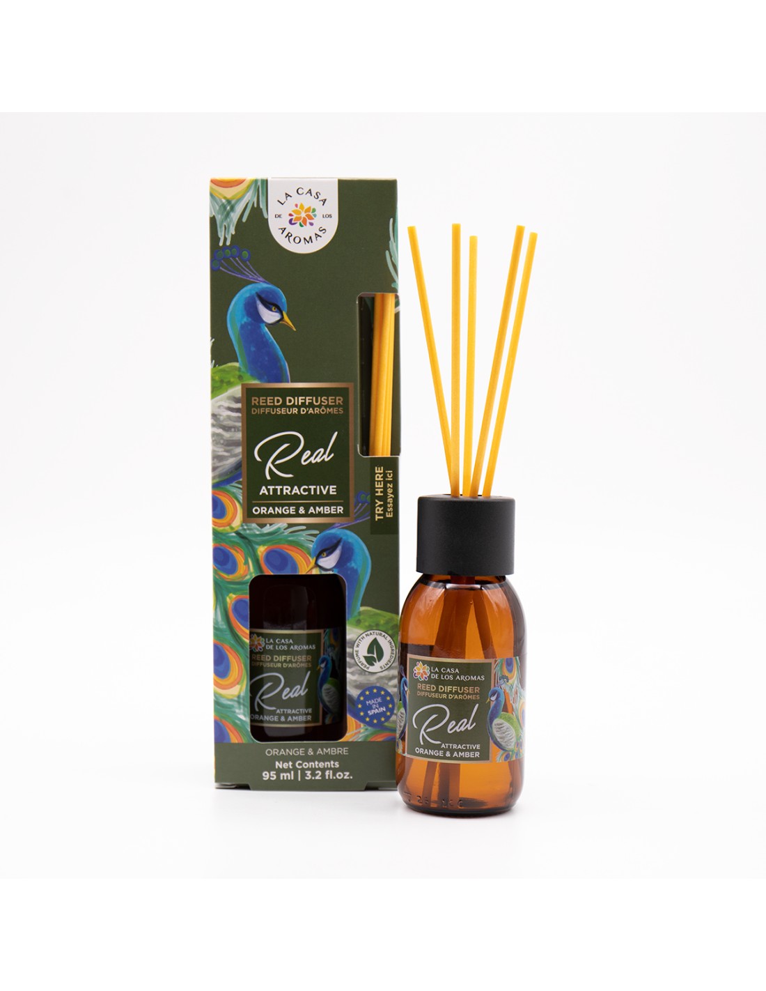 Patyczki zapachowe REAL ATTRACTIVE - ORANGE & AMBER mają olejek zapachowy pachnący soczystą, lekko cierpką pomarańczą połączoną z pięknym, żywicznym bursztynem.