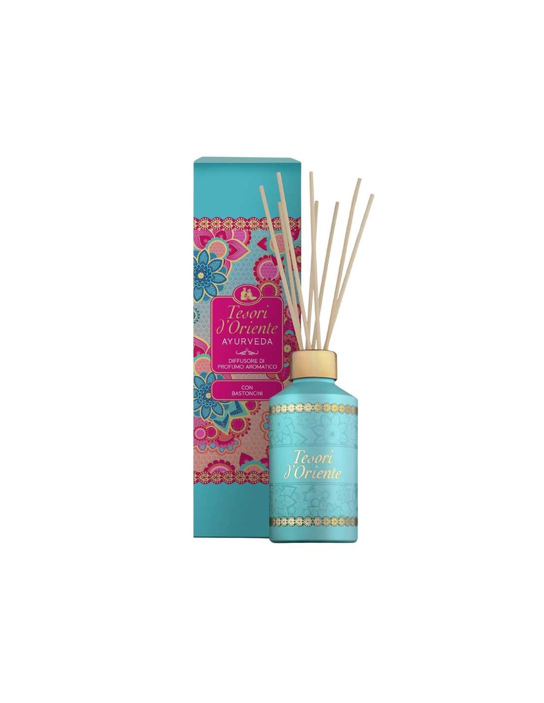 TESORI DORIEN Patyczki zapachowe Ayureda, 200 ml Tesori d'Oriente Ayurveda to coś więcej niż odświeżacz – to rytuał zapachu, który wniesie do Twojego wnętrza spokój i harmonię. Elegancka kompozycja nut zapachowych, z przewagą paczuli, drzewa cedrowego oraz olejków eterycznych, stworzy wyjątkową atmosferę sprzyjającą odprężeniu i regeneracji zmysłów.