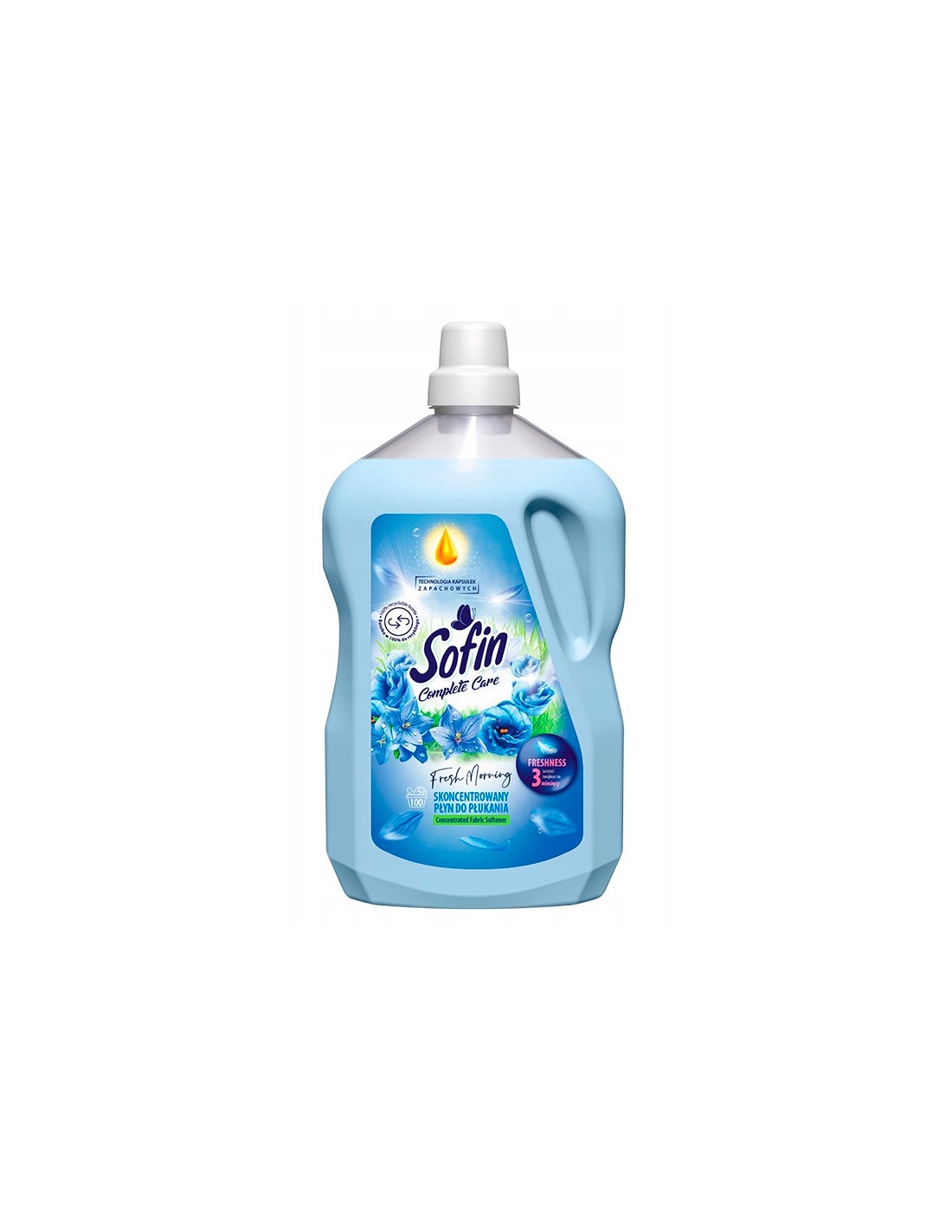 GLOBAL SOFIN Skoncentrowany płyn do płukania FRESH MORNING, 2,5 lDzięki technologii kapsułek zapachowych pozwala cieszyć się miękkością i świeżym zapachem ubrań nawet do 3 miesięcy przechowywania w garderobie.2,5 litra wystarcza aż na 100 płukania. Butelka w 100% przeznaczona do recyklingu, folia z perforacją ułatwiająca recykling, skoncentrowana formuła, technologia kapsułek zapachowych zapewnia świeżość i miękkość aż do 3 miesięcyDla efektu miękkiego prania użyć 25 ml na 4,5 kg wsadu. Dla efektu extra miękkiego prania użyć 40 ml na 4,5 kg wsadu. W przypadku płukania ręcznego użyj 15 ml na 10 litrów wody.Dzięki technologii kapsułek zapachowych pozwala cieszyć się miękkością i świeżym zapachem ubrań nawet do 3 miesięcy przechowywania w garderobie. Produkt zawiera etykietę cyfrową - specjalne udogodnienie dla osób mających problemy ze wzrokiem.Sofin 2,5L wystarcza aż na 100 płukań.Butelka w 100% przeznaczona do recyklingu, folia z perforacją ułatwiająca recykling, skoncentrowana formuła, technologia kapsułek zapachowych zapewnia świeżość i miękkość aż do 3 miesięcy.