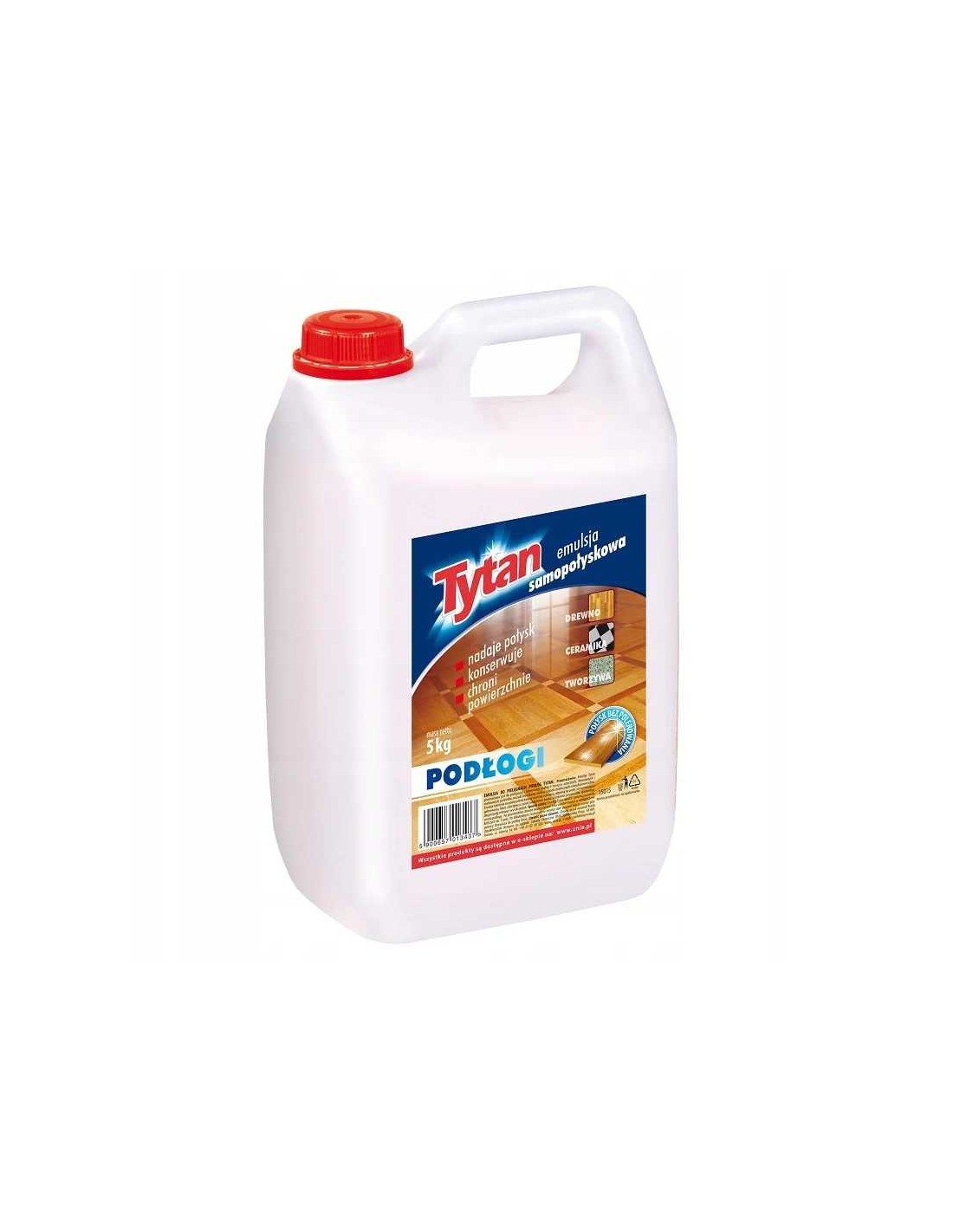 Emulsja do podłóg Tytan jest opracowana na bazie wysokiej jakości komponentów gwarantujących trwałą ochronę i połysk. Tworzy warstwę ochronną, zabezpiecza przed osiadaniem brudu i ścieraniem powierzchni.