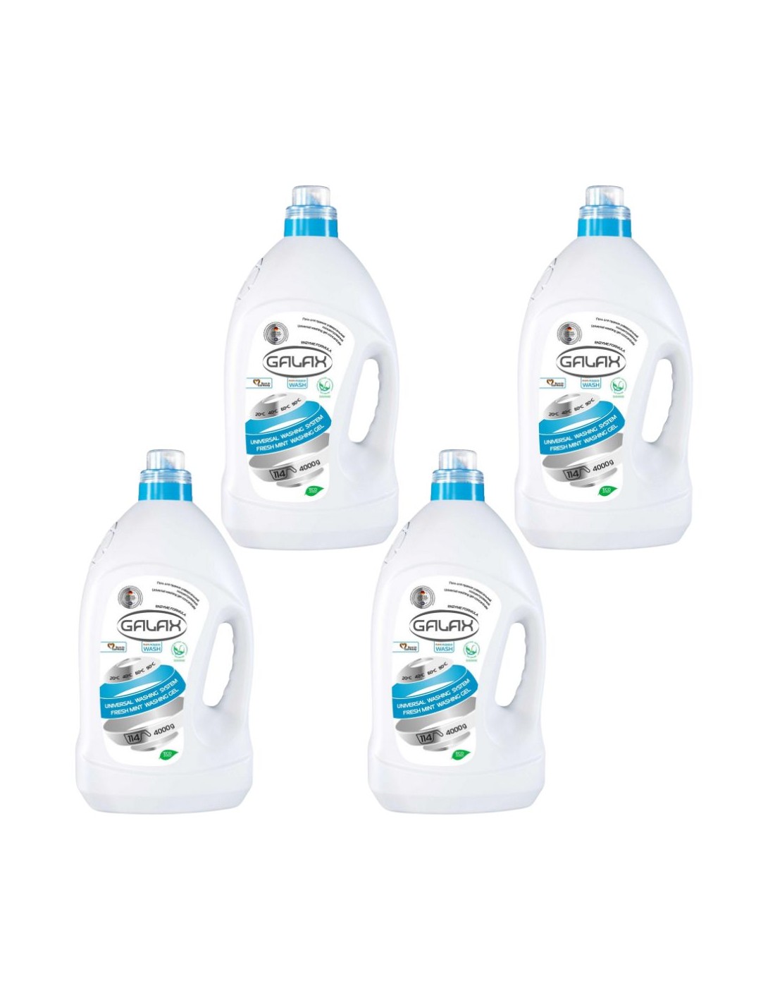 GALAX Żel do prania UNIWERSALNY ŚWIEŻA MIĘTA 114 prań, pakiet 4 x 4000 g Uniwersalny żel do prania GALAX to najlepszy wybór, jeśli zależy Ci na czystych i pachnących ubraniach Twoich i całej rodziny.GALAX to środek piorący przeznaczony do prania lnu, bawełny, tkanin syntetycznych i sztucznych oraz tkanin z włókien mieszanych w temperaturze od +20°C do +90°C (w zależności od tkaniny).Doskonale wypierze wszystkie ubrania bez względu czy są one jasne, ciemne czy kolorowe.Wypierz też śmiało żelem GALAX ręczniki czy pościel. Żel nada praniu odświeżającego, miętowego zapachu.Żel jest jest hipoalergiczny i nie powoduje podrażnień skóry.Dodatkowo jest on bezpieczny dla środowiskaŻEL DO PRANIA GALAX: