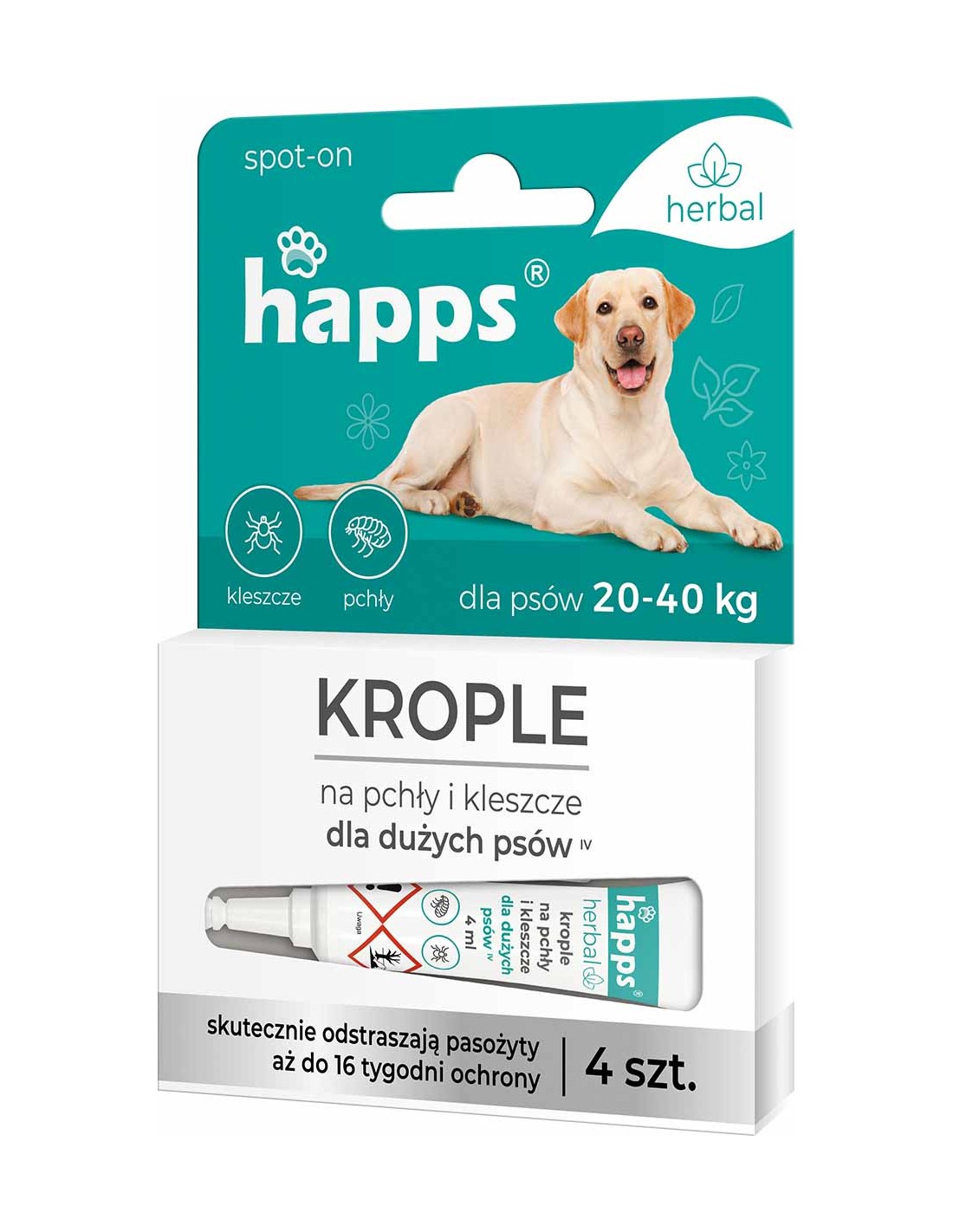 Krople HAPPS Herbal Może być stosowany zarówno u dorosłych zwierząt, jak i u szczeniąt powyżej 12 tygodnia życia. W przypadku stwierdzenia obecności pcheł u psa, należy najpierw pozbyć się pasożytów z sierści zwierzęcia i jego otoczenia stosując odpowiednio Happs szampon przeciw pchłom dla psów oraz spray Happs na pchły i kleszcze (opryskać nim legowisko, dywany oraz tapicerowane meble), a następnie regularnie aplikować krople Happs Herbal w celu ochrony przed kolejną inwazją pasożytów.