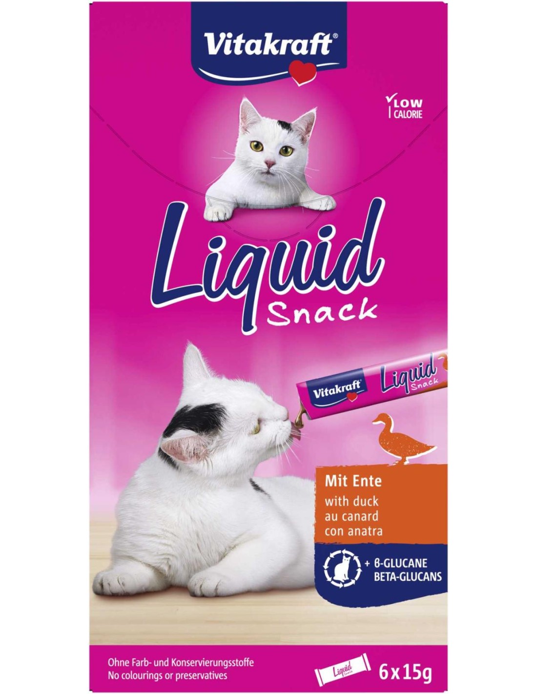 VITAKRAFT Przysmak, pasta dla kota KACZKA 6 x 15 g, 1 opKrem-pasta z kaczką i beta glukanami.VITAKRAFT CAT LIQUID SNACK pokarm uzupełniający dla kotów od 3 miesiąca życia.Specjalny przysmak - krem z kaczką i beta-glukanami,  wspomaga odporność organizmu (ß-glukany 500mg/kg)
