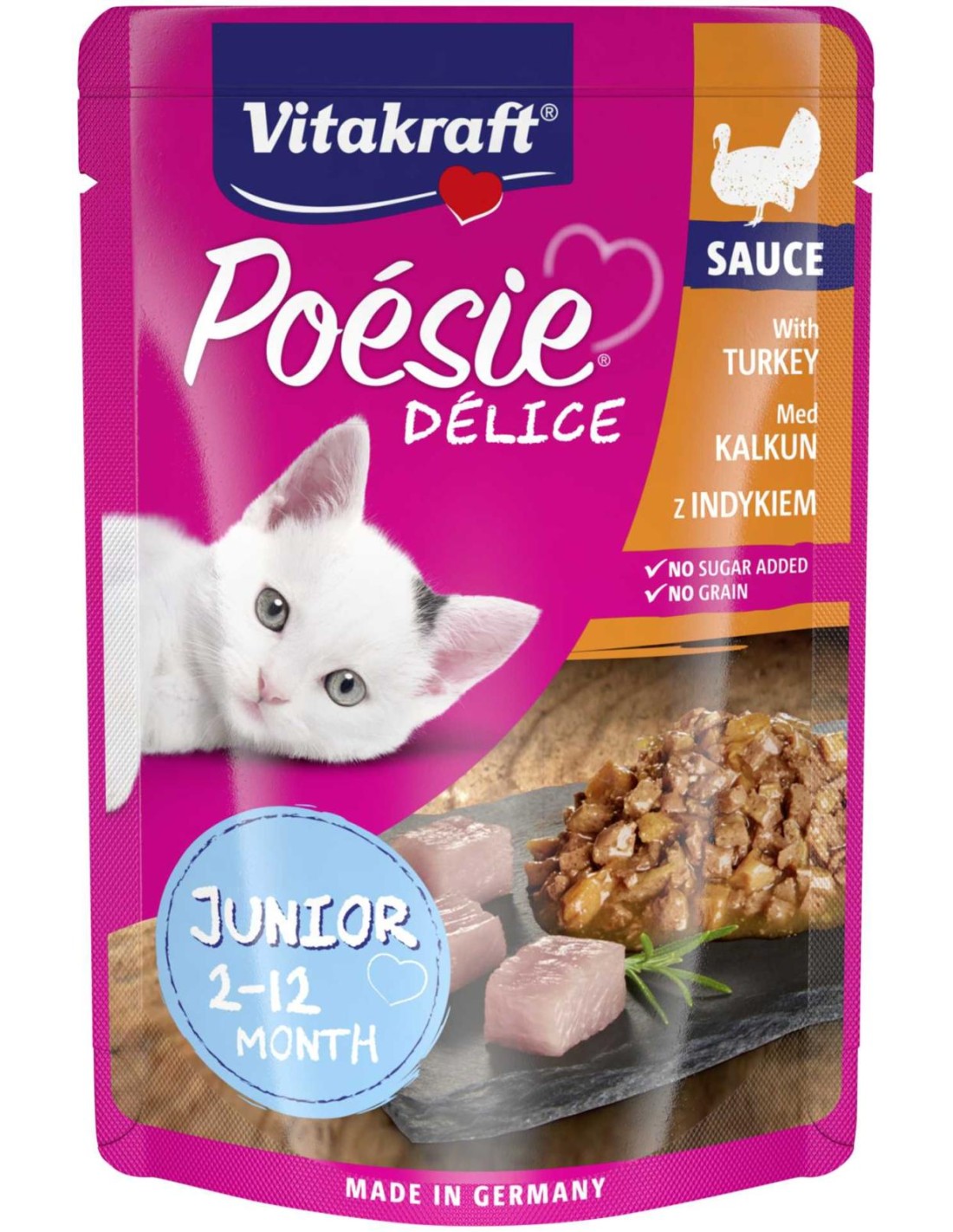 VITAKRAFT Karma dla kota Junior INDYK 85 g, 1 opChcesz zadbać o prawidłowy rozwój i zdrową dietę swojego małego kotka? Jeśli tak, to postaw już dzisiaj na sprawdzone rozwiązanie w postaci Vitakraft Poesie Delice pełnowartościowa karma dla młodych kotów z indykiem w łagodnym sosie. Produkt charakteryzuje się pysznym smakiem i wysoką zawartością niezbędnych składników odżywczych. Pełnowartościowa karma dla kotów od marki Vitakraft jest prosta w podawaniu, zajmie Ci to zaledwie kilka chwil.Opis produktu: