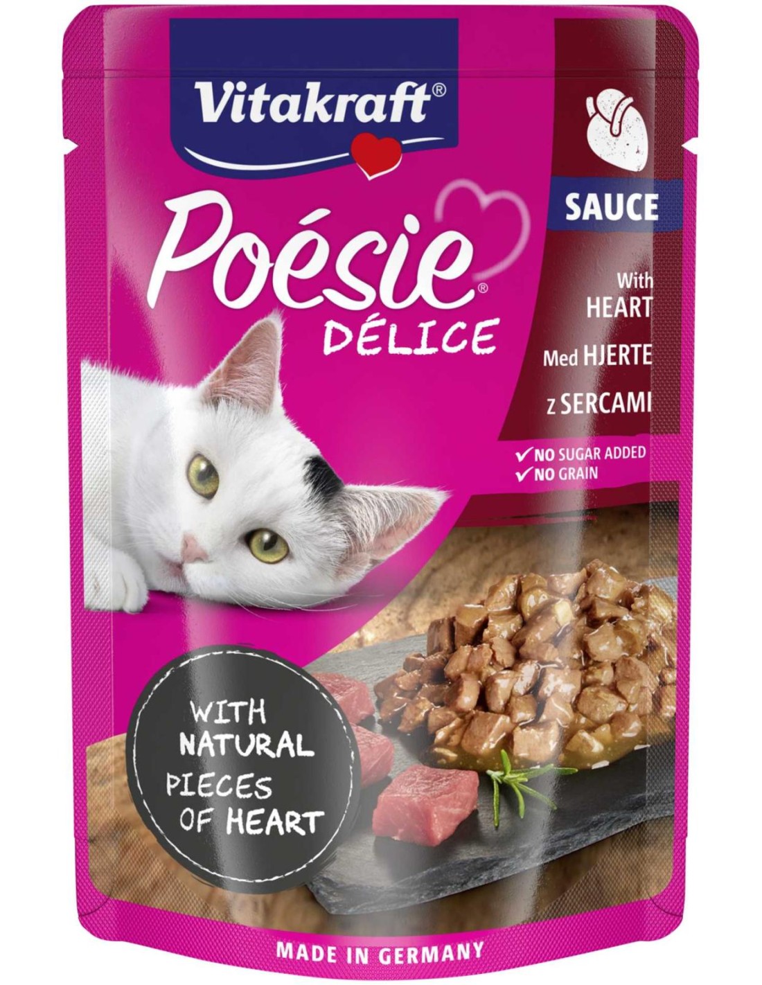 VITAKRAFT Karma dla kota SERCA 85 g, 1 opPoésie® Délice zawiera naturalne, wysokiej jakości kawałki serca dla czystej przyjemności, którą Twój kot pokocha. Najlepsze składniki gwarantują najwyższą jakość i są idealnie dopasowane pod względem odżywczym do potrzeb kota. Nawet Twoja ukochana nie będzie miała dość tego przysmaku. siła życiowa. Z miłości.Mokra karma dla dorosłych kotówZ cennym sercem w sosie