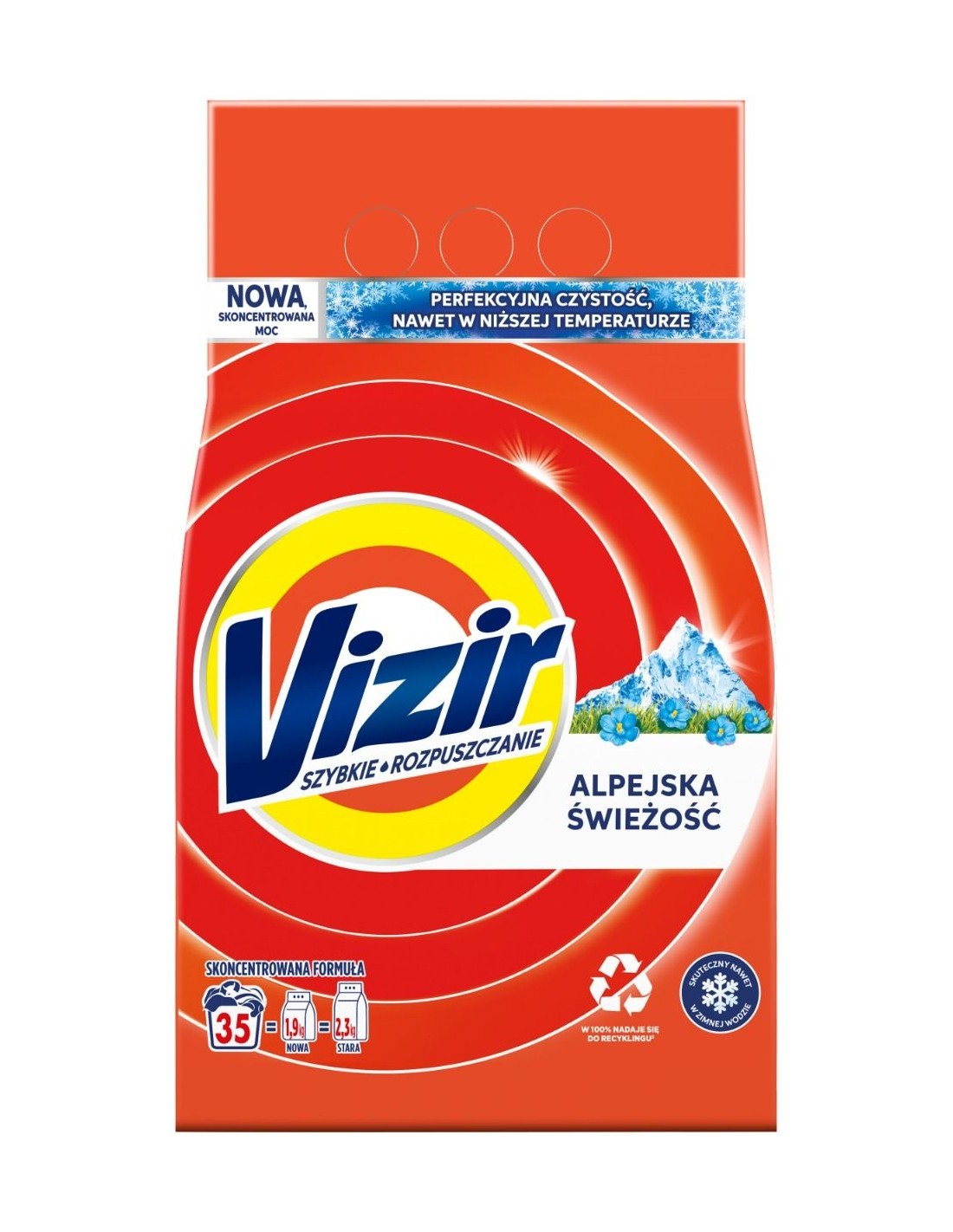 VIZIR Proszek do prania ALPEJSKA ŚWIEŻOŚĆ 35 prań, 1,925 kgNowa, skoncentrowana formuła proszku Vizir zapewnia perfekcyjną czystość i higieniczne pranie, nawet w niskiej temperaturze. Technologia Anti-Residue przeciwdziała osadom i sprawia, że ubrania są nieskazitelnie czyste. Efekty proszku do prania Vizir są widoczne już po pierwszym praniu, doskonale czyści ubrania z uporczywych zabrudzeń (z mankietów, kołnierzyków i miejsc pod pachami). Zapewnia olśniewającą czystość tkanin oraz naturalnie świeży, niezwykle przyjemny alpejski zapach.PROSZEK VIZIR:
