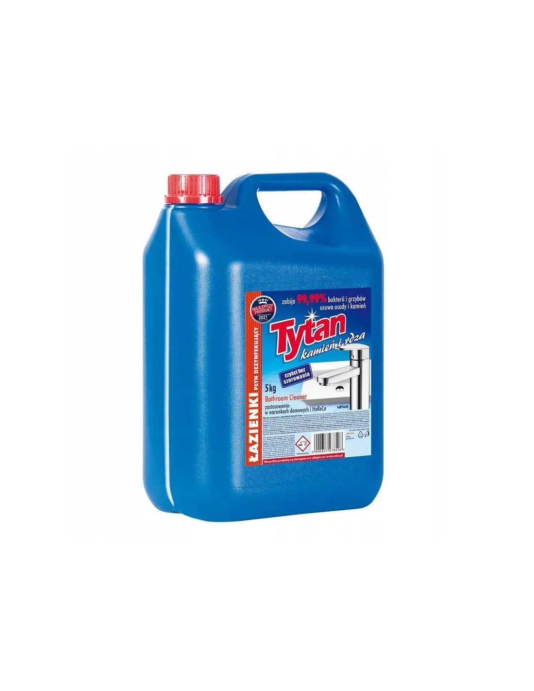 Płyn TYTAN do mycia łazienek przeznaczony jest głównie do mycia powierzchni z chromu, stali nierdzewnej (zlewozmywaki kuchenne), glazury, umywalki, wanny, szkła, plastiku (kabiny prysznicowe), armatury łazienkowej i inne.Dzięki opracowaniu specjalnej receptury stosowanie preparatu jest bardzo łatwe i nie wymaga użycia siły.