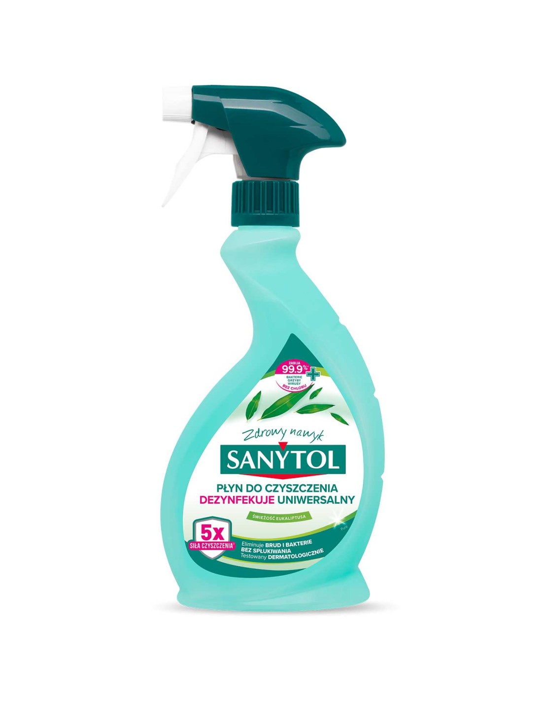 SANYTOL Uniwersalny spray czyści i dezynfekuje EUKALIPTUS, 500 mlSANYTOL Uniwersalny środek czyszczący i dezynfekujący w sprayu pomaga utrzymać czystość i higienę w domu. Praktyczny w użyciu, bez chloru. Do mycia wszelkich powierzhni. Idealnie usuwa zabrudzenia i jednocześnie dokładnie dezynfekuje.