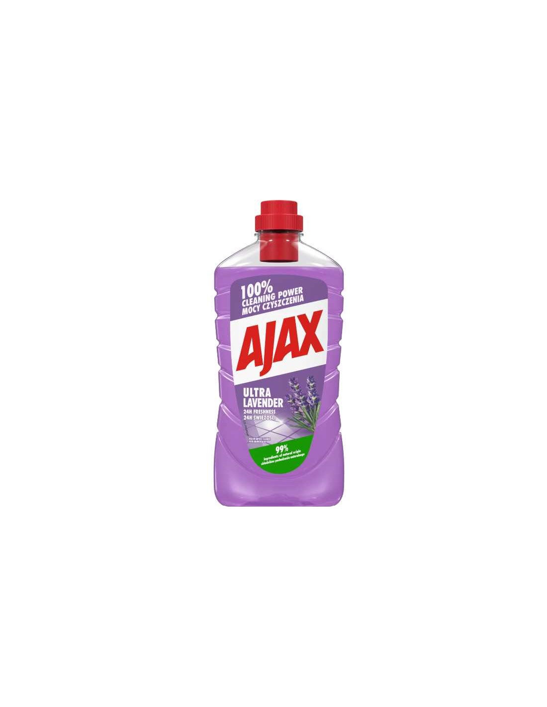 Ajax Uniwersalny Płyn do Mycia Ultra Lawenda 1L – Odświeżenie i Czystość w Jednym!Ajax Uniwersalny Płyn do Mycia Ultra Lawenda to doskonały wybór dla tych, którzy cenią sobie skuteczność i świeżość w codziennym sprzątaniu. Dzięki unikalnej formule, ten 1-litrowy płyn skutecznie radzi sobie z wszelkimi zabrudzeniami, pozostawiając powierzchnie lśniąco czyste i pięknie pachnące lawendą.Najważniejsze właściwości Ajax Ultra Lawenda:Ten środek czyszczący wyróżnia się nową technologią podwójnej świeżości, która uwalnia przyjemny zapach lawendy w dwóch falach, odświeżając Twój dom przez długi czas.- 100% skuteczności czyszczenia – efektywnie usuwa brud i zanieczyszczenia. - Orzeźwienie przez 24 godziny – podwójna świeżość, która utrzymuje się przez cały dzień.- 99% składników pochodzenia naturalnego – bezpieczny dla zdrowia i środowiska.- 93% biodegradowalny – przyjazny dla natury, łatwy do rozkładu.- Skuteczny nawet w zimnej wodzie – oszczędność energii i wody.- Wegański i dermatologicznie testowany – odpowiedni dla osób dbających o zdrowie i etykę.Jak stosować Ajax Uniwersalny Płyn do Mycia Ultra Lawenda?Aby uzyskać najlepsze rezultaty, wystarczy rozcieńczyć płyn w wodzie zgodnie z instrukcjami na opakowaniu. Doskonale sprawdzi się do mycia wszystkich zmywalnych powierzchni – od płytek po meble.Dlaczego warto wybrać Ajax Ultra Lawenda?Wybierając Ajax Uniwersalny Płyn do Mycia Ultra Lawenda, zyskujesz potężne narzędzie do sprzątania, które łączy efektywność z ekologicznymi właściwościami. Dzięki 99% składnikom pochodzenia naturalnego oraz 93% biodegradowalności, dbasz o środowisko, jednocześnie ciesząc się czystością w swoim domu. Przyjemny zapach lawendy sprawi, że każda chwila spędzona w sprzątaniu stanie się przyjemnością.Odkryj magiczne właściwości czyszczące z Ajax Uniwersalnym Płynem do Mycia Ultra Lawenda 1L i nadaj swojemu domowi wyjątkową świeżość!Składniki: Less than 5% Anionic Surfactants. Perfumes Glutaral.