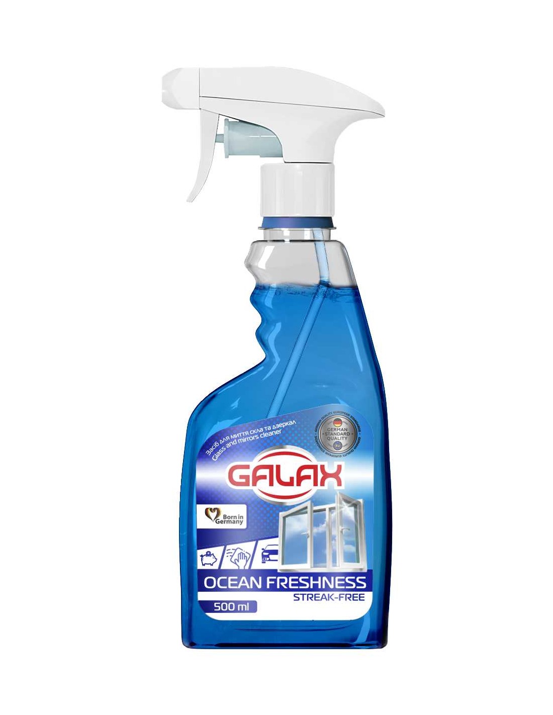 GALAX Płyn do mycia szyb i luster OCEANICZNA ŚWIEŻOŚĆ, 500 ml Płyn do mycia szyb, luster i innych szklanych powierzchni GALAX z powodzeniem wyczyści na błysk powierzchnie różnego rodzaju, jak na przykład: okna, witryny, lustra, szyby samochodowe, płytki, panele zewnętrzne sprzętu AGD, a także powierzchni chromowanych i innych.Środek GALAX do szyb zawiera amoniak, który skutecznie usuwa brud, tłuszcz, sadzę, oleje mineralne.Nie pozostawia plam ani nieestetycznych smug, pozostawia natomiast przyjemny zapach oceanicznej świeżości.Sposób użycia: