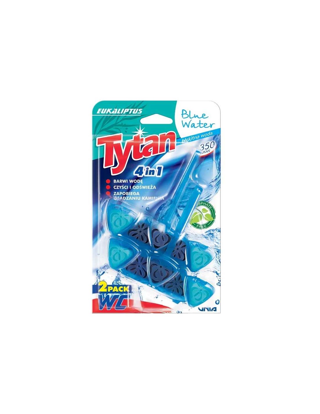 TYTAN BLUE WATER Zawieszka do toalety barwiąca wodę EUKALIPTUS, 2x40 gZawieszka do toalety TYTAN BLUE WATER to produkt, który spełnia 4 funkcje: czyści, odświeża, zapobiega osadzaniu się kamienia i barwi wodę na niebiesko, zwiększając jej walory estetyczne.Można ją dopasować do każdej muszli ustępowej, jest bardzo prosta w użyciu, dodatkowo ma odświeżający eukaliptusowy zapach. Zawieszka dzięki ulepszonej recepturze działa nawet do 250 spłukań. Zawieszki TYTAN są produkowane w trosce o środowisko naturalne! Produkt w swoim składzie nie zawierają fosforanów, co oznacza, że są bardziej przyjazne środowisku, a opakowanie nadaje się do ponownego przetworzenia.TYTAN BLUE WATER 4w1: