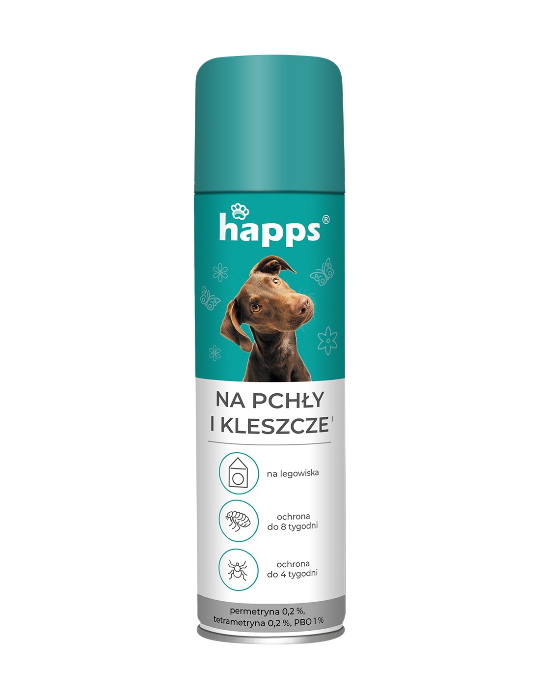 Aerozol do zwalczania pcheł i kleszczy BROS HAPPS w otoczeniu psów (legowiska, wnętrza bud, dywany).