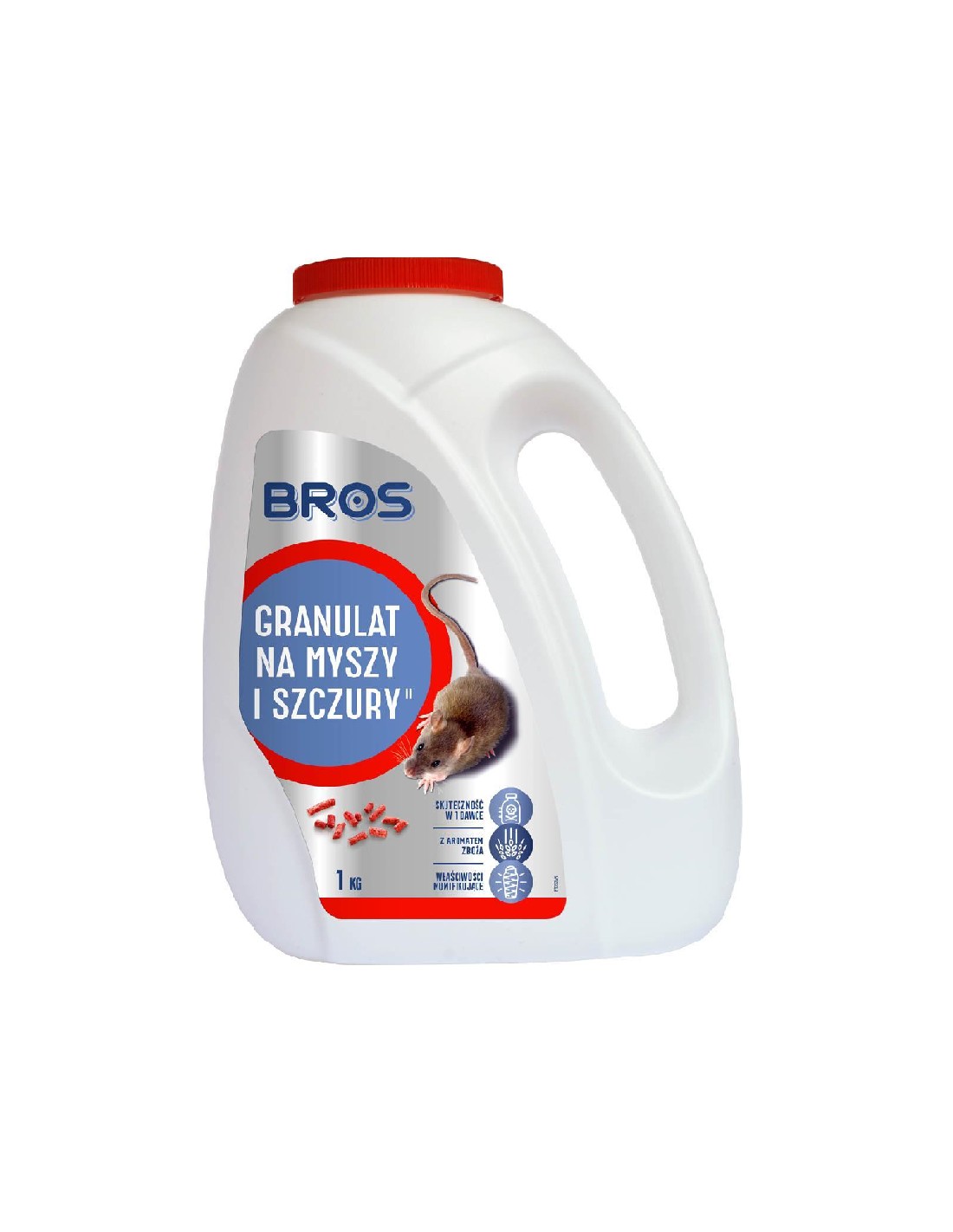 BROS Granulat na myszy i szczury, 1 kg Granulki zawierają tylko substancje pokarmowe bez stosowanych w innych trutkach wypełniaczy.Produktów biobójczych należy używać z zachowaniem środków ostrożności. Przed każdym użyciem należy przeczytać etykietę i informacje dotyczące produktu.