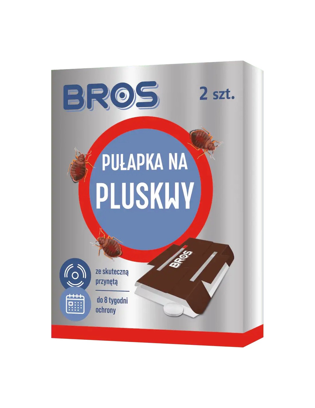 BROS Pułapka na pluskwy LEPOWA, 2 sztLepowa pułapka na pluskwy BROS przeznaczona jest do monitorowania obecności pluskiew domowych poprzez ich odławianie. Zawiera przynętę w postaci pastylki, która przyciąga pluskwy do pułapki. Pozostaje skuteczna do 4 tygodni. Pułapka nie zawiera substancji owadobójczych, a jej kształt sprawia, że złapane szkodniki są niewidoczne. W opakowaniu znajdują się 2 pułapki lepowe oraz 2 pastylki.Zastosowanie pułapki monitorującej obecność owadów biegających umożliwia podjęcie decyzji o ewentualnym zastosowaniu środka biobójczego, celem ich zwalczenia.Sposób użycia: