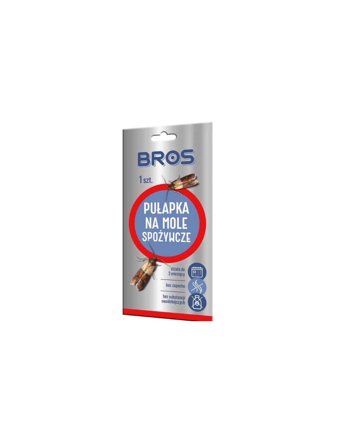 BROS Pułapka na mole spożywcze, 1 szt -działa do 3 miesięcy-bez zapachu-bez substancji owadobójczychBezwonny lep do monitorowania obecności moli spożywczych w pomieszczeniach takich jak kuchnie, spiżarnie i magazyny oraz bezpośrednio w szafach z produktami spożywczymi. Działa wyłącznie w sposób fizyczny – dorosłe osobniki moli spożywczych przyklejają się do pułapki lepowej, co pozwala na wczesne wykrycie obecności tych owadów w pomieszczeniu i ocenę ich liczby.Jeden lep działa aż do 3 miesięcy. Nie zawiera chemicznych środków owadobójczych, dlatego może być stosowany w bezpośrednim sąsiedztwie produktów spożywczych takich jak mąka, kasza, makarony, płatki, kawa, herbata, kakao, suszone owoce. Można go przykleić w dowolnym miejscu lub powiesić wykorzystując otwór w pułapce.Obserwacja przyklejonych do pułapki moli umożliwia podjęcie decyzji o ewentualnym zastosowaniu odpowiedniego środka biobójczego marki Bros celem ich zwalczenia. Obecność nawet jednego dorosłego osobnika mola spożywczego w pułapce jest wskazaniem do zastosowania takiego preparatu.Pułapka nie jest produktem biobójczym.Sposób użycia:1. Wyjąć lep z opakowania.2. Oderwać pasek zabezpieczający taśmę mocującą i przykleić lep w wybranym miejscu.3. Przytrzymać lep za górny margines nie pokryty klejem i zerwać papier zabezpieczający klej, aktywując pułapkę.4. Lep można także zawiesić wykorzystując przeznaczony do tego otwór.5. W szafkach stosować 1 szt., w pomieszczeniach takich jak kuchnie i spiżarnie 2 szt. Lep wymienić po 3 miesiącach lub po zapełnieniu owadami.6. Zabrudzenia po kleju zmyć ze skóry oliwką lub naftą kosmetyczną.