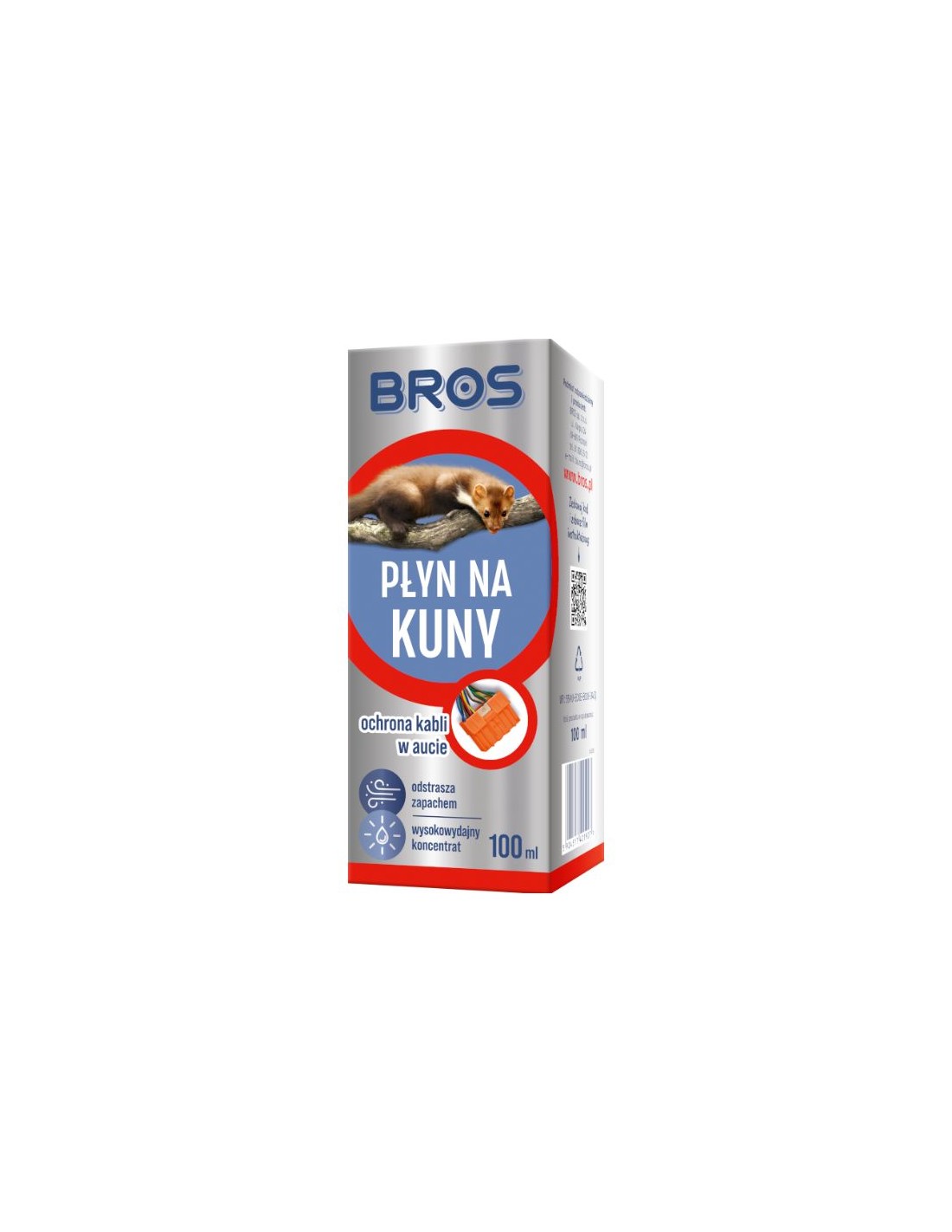 BROS Płyn na kuny, 100 ml -Może być stosowany w pomieszczeniach, pojazdach i na terenach otwartych.-Przy sprzyjających warunkach pogodowych działa aż do 8 tygodni.Produktów biobójczych należy używać z zachowaniem środków ostrożności.Przed każdym użyciem należy przeczytać etykietę i informacje dotyczące produktu.Przed użyciem wstrząsnąć. Stosować w budynkach (mieszkalnych, gospodarczych, użyteczności publicznej, w garażach i na strychach), pojazdach i urządzeniach oraz innych miejscach, w których zaobserwowano szkody wyrządzone przez kuny. Nasączyć szmatkę preparatem i umieścić ją w szklance lub płytkim pojemniku ustawionym w chronionym miejscu. W celu zabezpieczenia kabli, pokryć je nierozcieńczonym preparatem. Stosować w dawce 25 ml.Przy bezdeszczowej pogodzie produkt pozostaje skuteczny aż do 8 tygodni. Po intensywnych opadach deszczu zabieg w terenie otwartym powtórzyć.