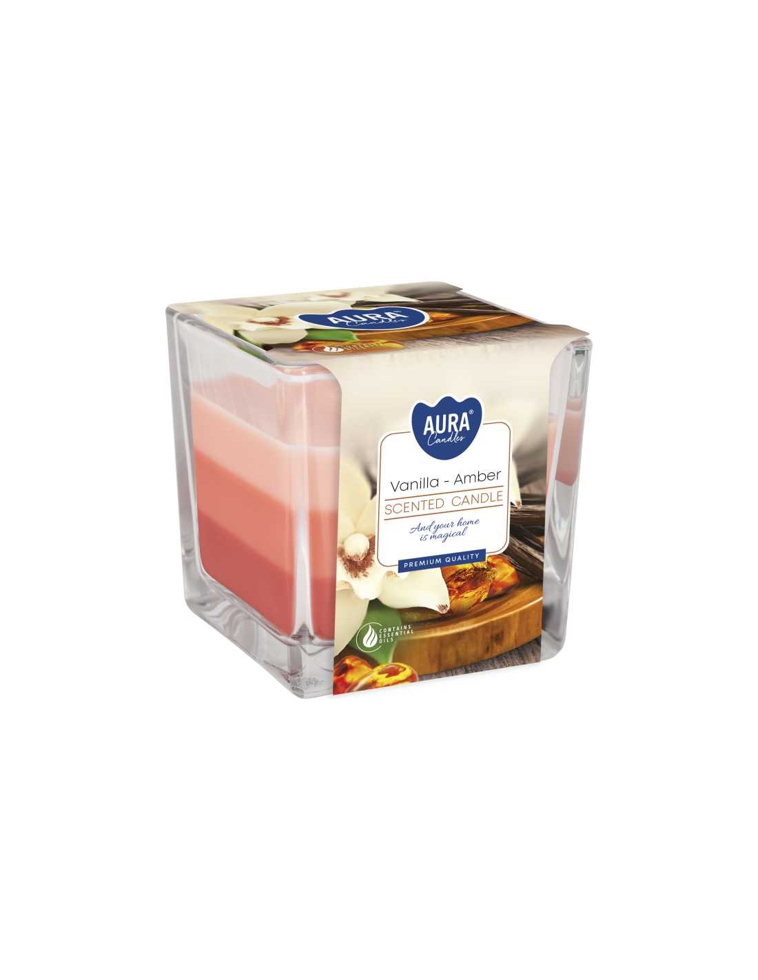 BISPOL AURA Świeca zapachowa w szkle trójkolorowa SNK80-355 WANILIA - BURSZTYN, 1 sztWspaniały aromat świeczek AURA tworzy niezapomniany klimat, podkreśla ważność chwili, umila wieczór czy rodzinne spotkania. Trójkolorowe świece w szkle wypełnione są pachnącym woskiem, który stopniowo uwalnia swój aromat do pomieszczenia wypełniając wnętrze przyjemnym zapachem.Świece w kwadratowym szkle z trójkolorową zalewą to idealne rozwiązanie dla osób ceniących funkcjonalność i nowoczesny design. Dzięki dwóm knotom blask świecy jest intensywniejszy.Pośród bogatej gamy zapachowej świeczek BISPOL AURA każdy znajdzie swój ulubiony aromat dla siebie, aby w ten prosty sposób poprawić sobie nastrój i umilić chwilę.Świece BISPOL świetnie nadają się do użytku zarówno w domu, hotelu, restauracji, sali bankietowej, gabinetach masażu, salonach kosmetycznych czy innych miejscach, gdzie zapach, ładny zapach ma znaczenie. Czas palenia świecy to około 32 godziny.* UWAGA: Szata graficzna może nieznacznie różnić się od tej prezentowanej na zdjęciu.