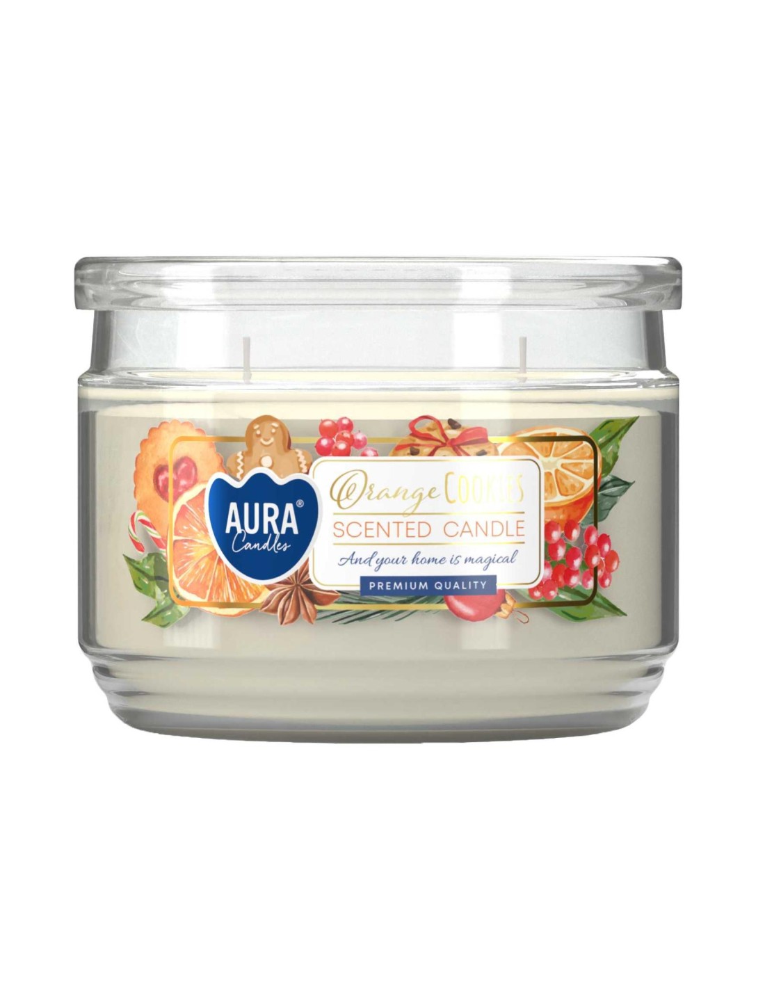 BISPOL AURA Świeca zapachowa w niskim słoju SNP106-450 POMARAŃCZOWE CIASTECZKA, 1 sztZapachowe świece w niskim słoju to nowość w ofercie AURA, która łączy w sobie elegancję z funkcjonalnością. Dwa bawełniane knoty zapewniają równomierne wypalanie się świecy oraz intensywny, przyjemny aromat. Świeca pasuje wizualnie zarówno do nowoczesnych, jak i klasycznych wnętrz.