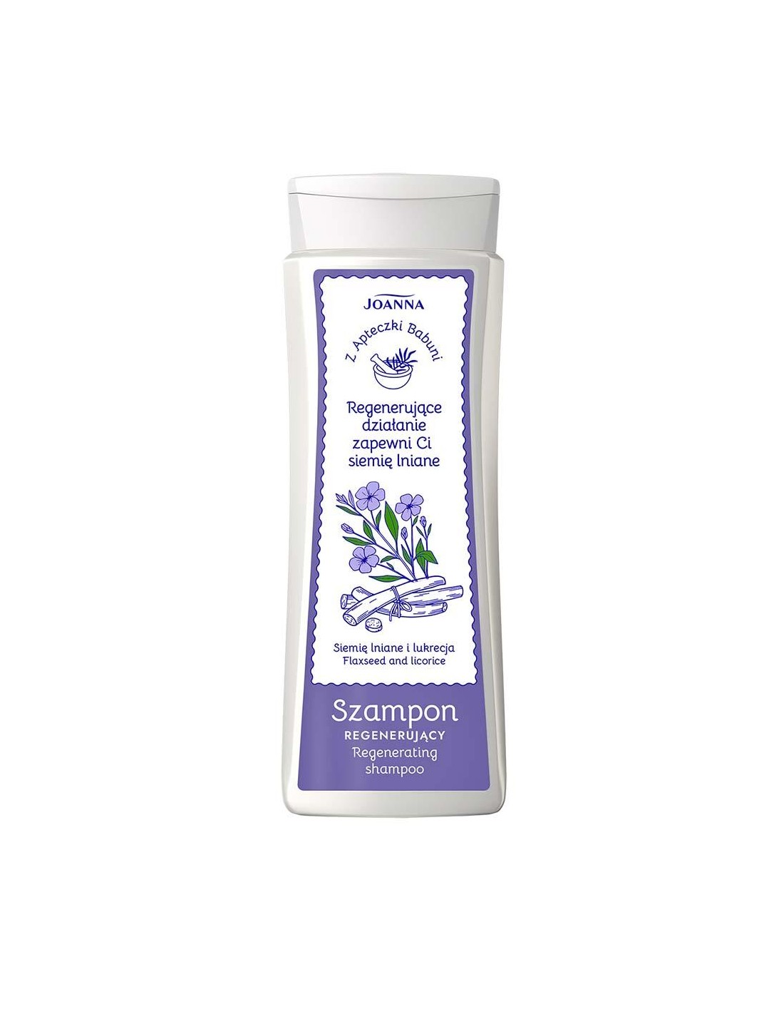 JOANNA Z APTECZKI BABUNI Regenerujący szampon do włosów SIEMIĘ LNIANE & LUKRECJA, 300 mlRegenerujący szampon do włosów JOANNA Z APTECZKI BABUNI idealnie sprawdzi się d o mycia włosów suchych i zniszczonych. Szampon z siemieniem lnianym i lukrecją, sprawi że skóra głowy i włosy będą dokładnie oczyszczone, cebulki włosów wzmocnione, a kosmyki lśniące i gładkie.