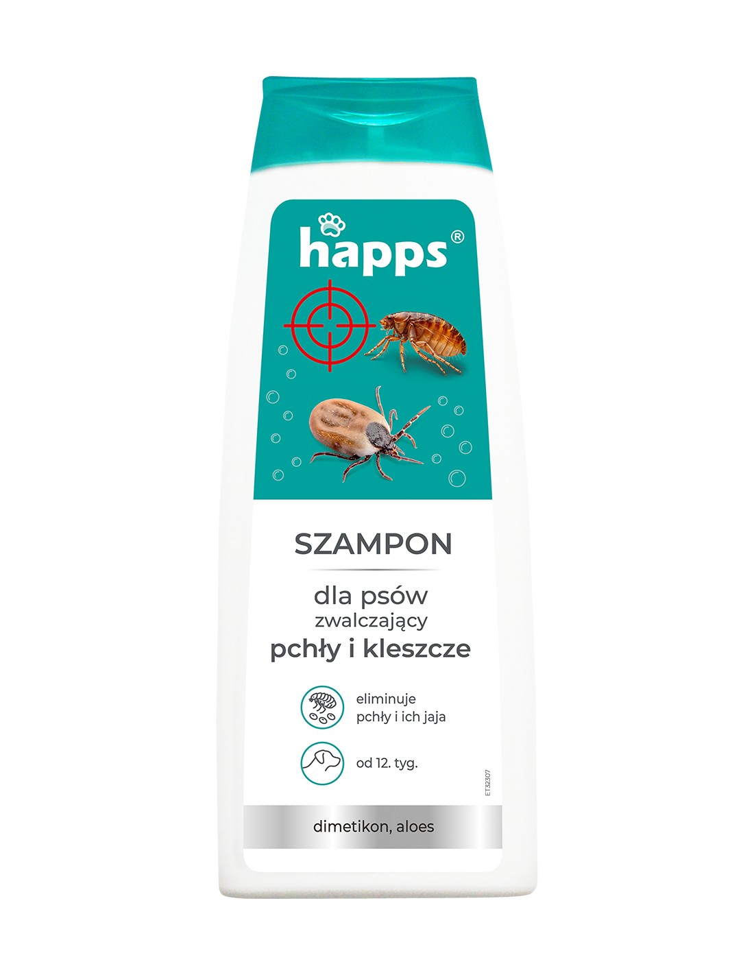 Szampon HAPPS skutecznie zwalcza pchły i kleszcze poprzez fizyczne zablokowanie podstawowych funkcji życiowych pasożytów i jaj pcheł.