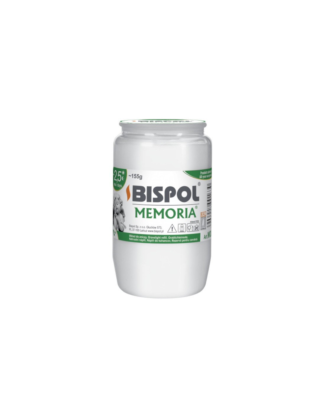 BISPOL Wkład do zniczy OLEJOWY, WO3, 1 szt Nie kopci, spala się równomiernie jasnym czystym płomieniem. Dostępny w wielu rozmiarach.Waga:-155 gCzas palenia:-2,5 dniaWysokość:-9,5 cmŚrednica:-ø5,7 cm