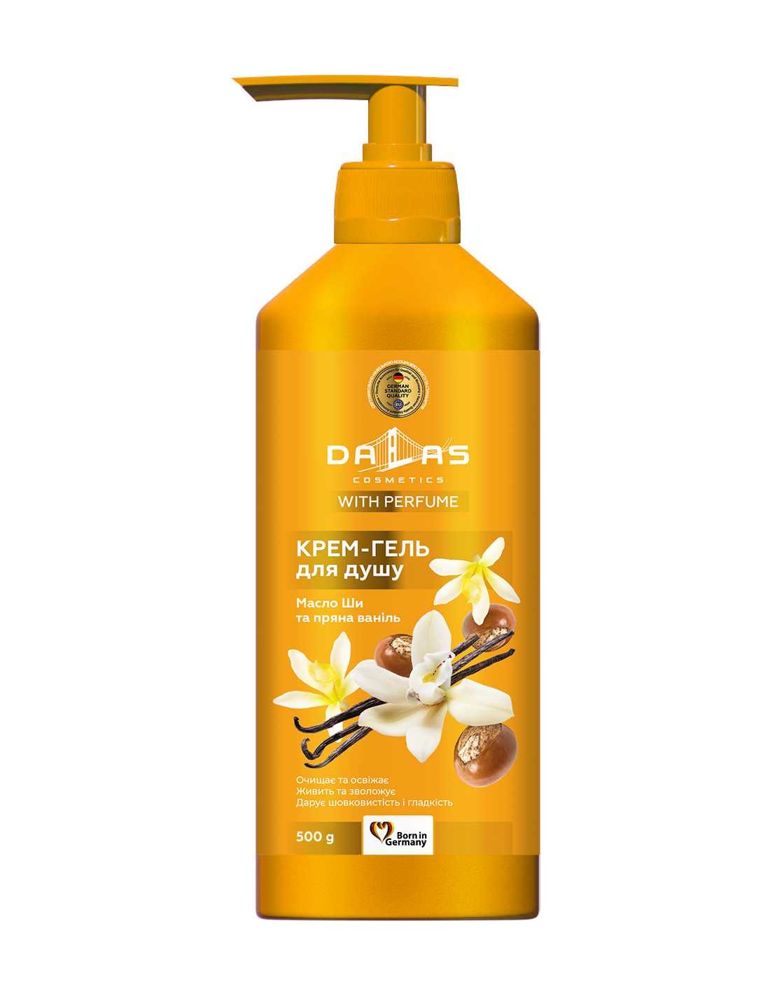 DALAS Żel pod prysznic MASŁO SHEA I VANILLA, 500 gKremowy żel pod prysznic MASŁO SHEA I WANILIA od DALAS czyni z kąpieli prawdziwy rytuał.Zachwycający, obłędnie waniliowo - kremowy zapach przyjemnie relaksuje i dodaje energii.Kremowy żel delikatnie oczyszcza i odświeża skórę. Pielęgnujące składniki jego formuły czyli masło shea i pikantna wanilia zapewniają odżywienie i niezbędny poziom nawilżenia skóry, chronią ją, nadają jedwabistość i gładkość.Żel DALAS wykazuje działanie zarówno odświeżające, oczyszczające oraz nawilżające. Sposób użycia: nanieść krem-żel na myjkę lub dłoń, delikatnie spienić i rozprowadzić po całym ciele, a następnie spłukać pianę wodą.Skład: Water, Sodium Laureth Sulfate, Cocamidopropyl Betaine, Glycerin,PEG-7 Glyceryl Cocoate, Parfum, Sodium Chloride, Cocamide MEA, Butyrospermum Parkii Butter, Styrene/Acrylates Copolymer, Polyquaternium-7, Glycol, Distearate, Citric Acid, Tetrasodium EDTA, Laureth-4,methylchloroisothiazolinone, methylisothiazolinone.