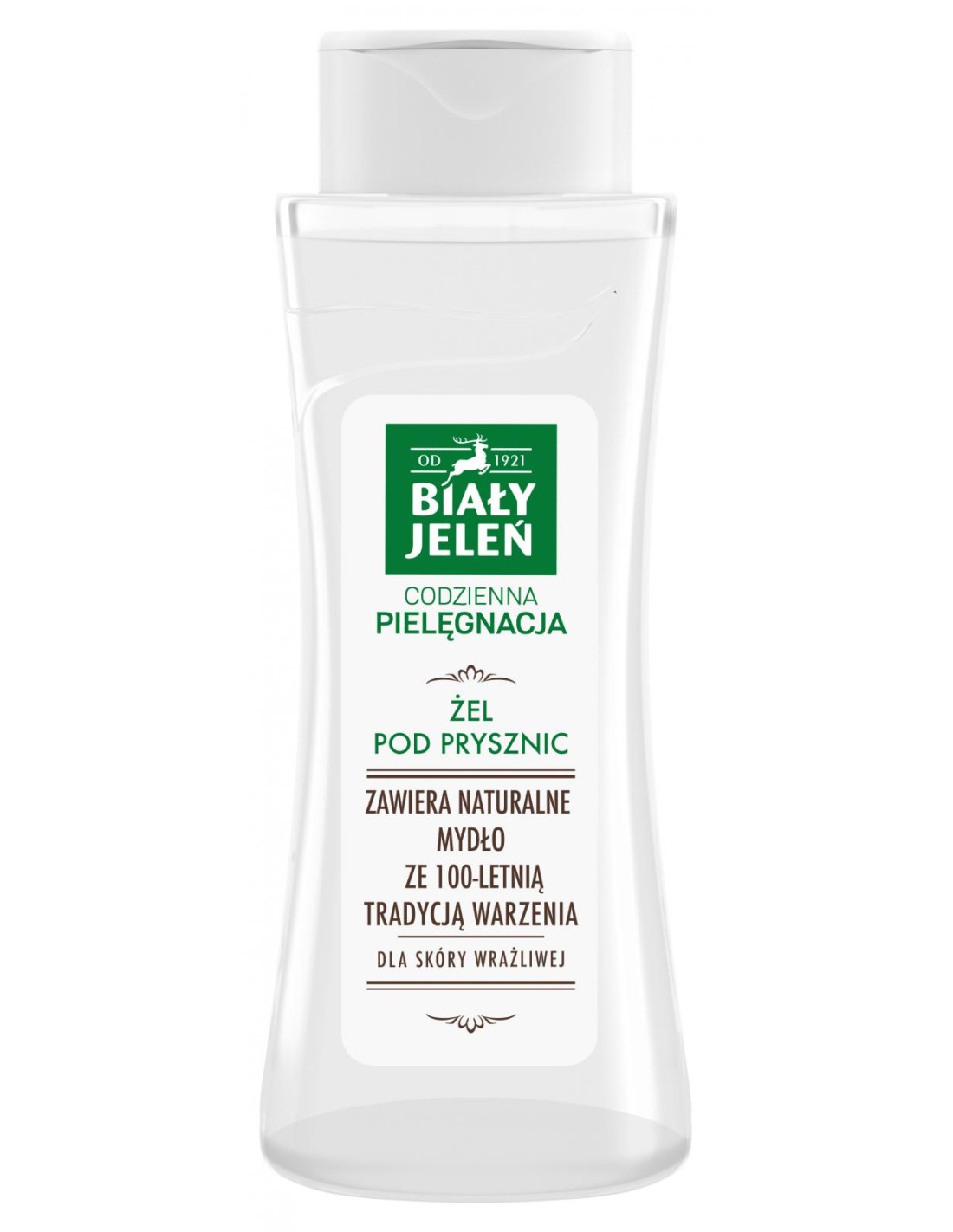 BIAŁY JELEŃ Żel pod prysznic NATURALNY, 250 mlNaturalny, delikatny myjący żel. Idealny dla osób z wrażliwą i skłonną do alergii skórą.Oczyszcza i pielęgnuje skórę, pozostawiając ją nawilżoną i przyjemną w dotyku. Hipoalergiczny żel pod prysznic Biały Jeleń wyprodukowany został bez dodatku sztucznych barwników, silikonów i alergenów. Dermatologicznie przebadany wśród osób z problemami alergicznymi.Najważniejsze cechy hipoalergicznego żelu pod prysznic Biały Jeleń to: